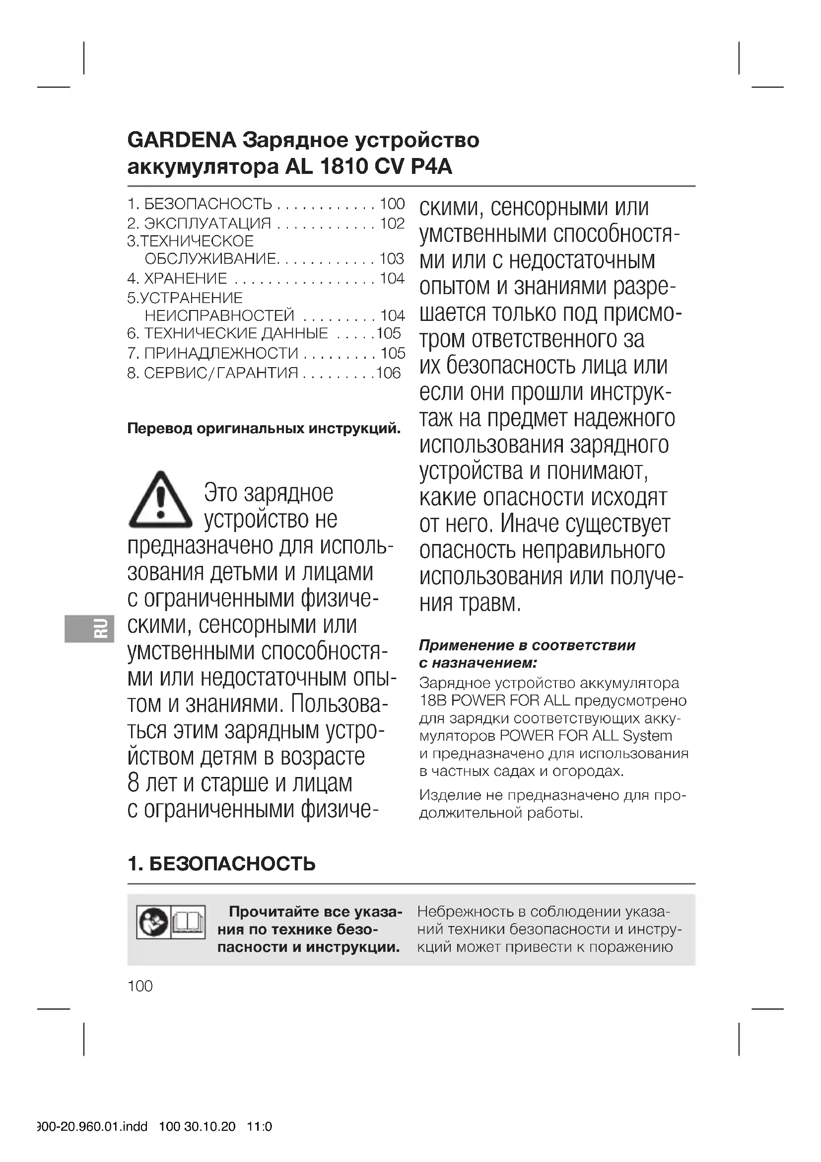 Применение в соответствии с назначением: Зарядное устройство аккумулятора 18В POWER FOR ALL предусмотрено для зарядки соответствующих акку- муляторов POWER FOR ALL System и предназначено для использования в частных садах и огородах. Изделие не предназначено для про- должительной работы. 14900-20.960.01.indd 100 30.10.20 11:08RU