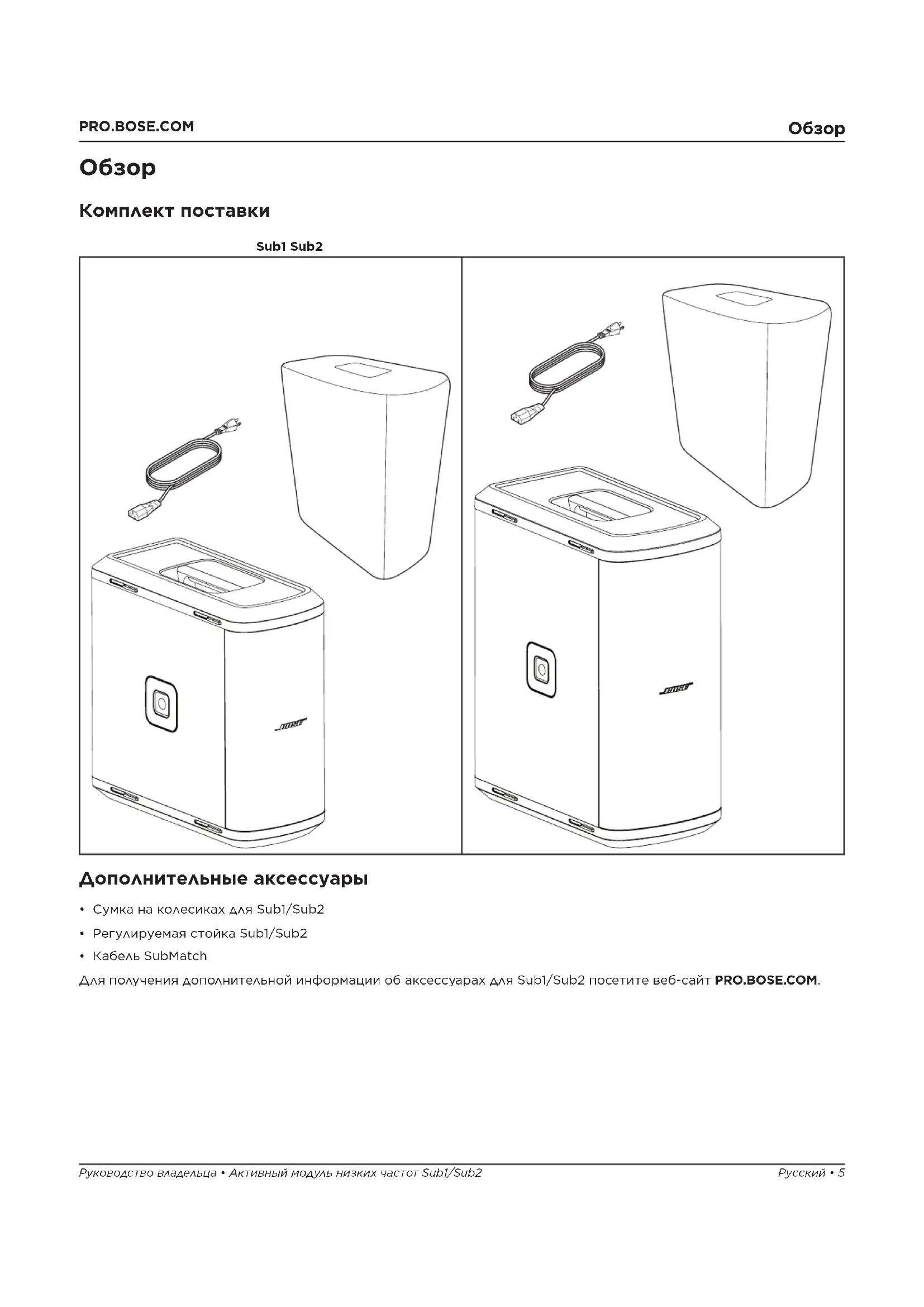 - Кабель SubMatch Для получения дополнительной информации об аксессуарах для Sub1/Sub2 посетите веб-сайт PRO.BOSE.COM.6 • Русский Активный модуль низких частот Sub1/Sub2 • Руководство владельца