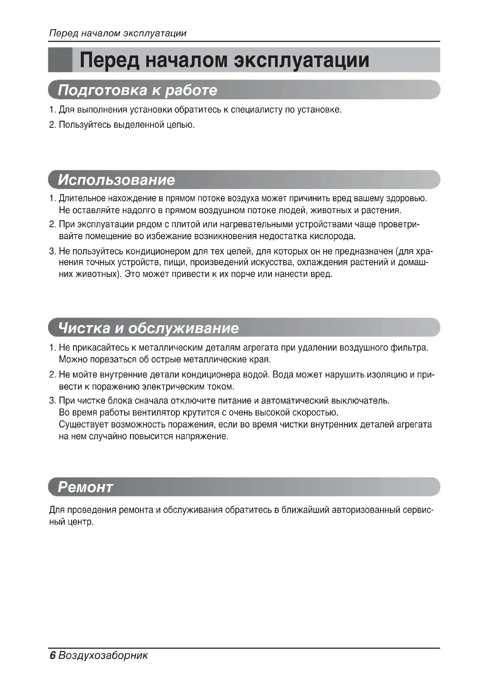 Если кондиционер не будет использоваться длительное время. Советы по эксплуатации Полезная информация Воздушные фильтры и экономия электроэнергии.Если воздушный фильтр забит пылью, то мощ-ность охлаждения будет падать и 6% электро-энергии, потребляемой кондиционером, будетрасходоваться впустую.Если не планируется использование втечение длительного времени.Если планируется дальнейшее использо-вание кондиционера.Включите кондиционер на 2-3 часа соследующими установками.• Режим работы: режим вентиляции.• Это позволит просушить внутренние ме-ханизмы.Отключите автоматический выключатель.Если кондиционер не будет использоваться длитель-ное время, отключите автоматический выключатель.Скопившаяся грязь может привести к воз-горанию.Очистите воздушный фильтр иснова установите его во внутрен-ний блок.Убедитесь, что воздухозаборное ивыпускное отверстиявнутреннего/внешнего блока не за-блокированы.Проверьте правильность заземле-ния. Оно может быть подключено состороны внутреннего блока.Не переохлаждайте поме-щение.Это вредно для здоровья ивлечет перерасход электро-энергии.Держите закрытыми жа-люзи или занавески.Во время работы кондицио-нера не допускайте попада-ния в помещение прямогосолнечного света.Поддерживайте во всем помеще-нии равномерную температуру.Настройте направление воздушногопотока по вертикали и по горизонталитаким образом, чтобы обеспечить рав-номерную температуру в помещении.Убедитесь, что двери иокна плотно закрыты.Старайтесь не открыватьдвери и окна, чтобы не вы-пускать холодный воздухиз помещения.Регулярно чистите воздуш-ный фильтр.Засорение фильтра приводит кснижению интенсивности воз-душного потока и снижает эф-фект охлаждения и осушения.Производите чистку как мини-мум раз в две недели.Время от времени провет-ривайте комнату.Поскольку окна постояннозакрыты, рекомендуетсявремя от времени их откры-вать.Обслуживание и ремонт 12 Воздухозаборник
