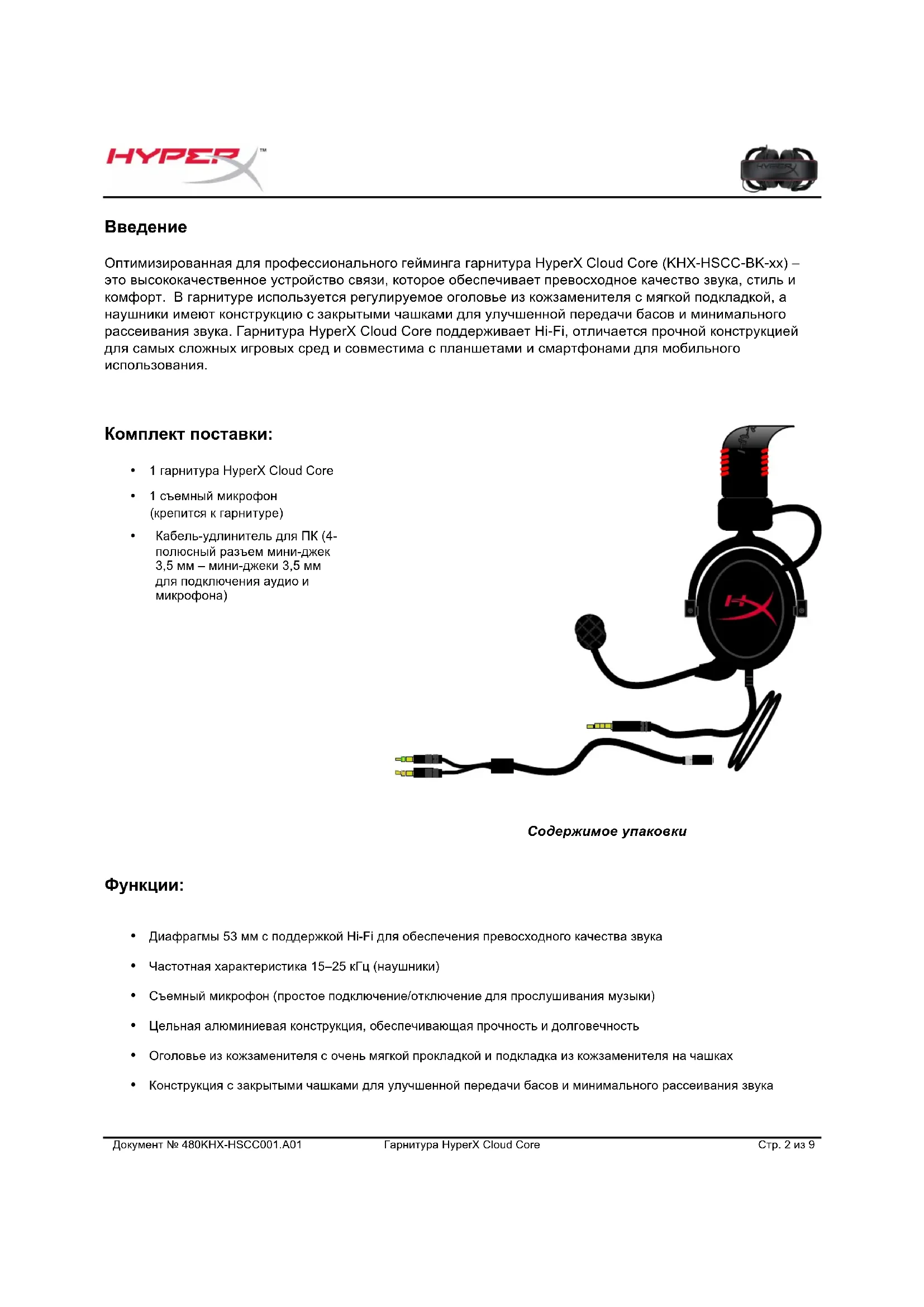 - Конструкция с закрытыми чашками для улучшенной передачи басов и минимального рассеивания звукаДокумент № 480KHX-HSCC001.A01 Гарнитура HyperX Cloud Core Стр. 3 из 9