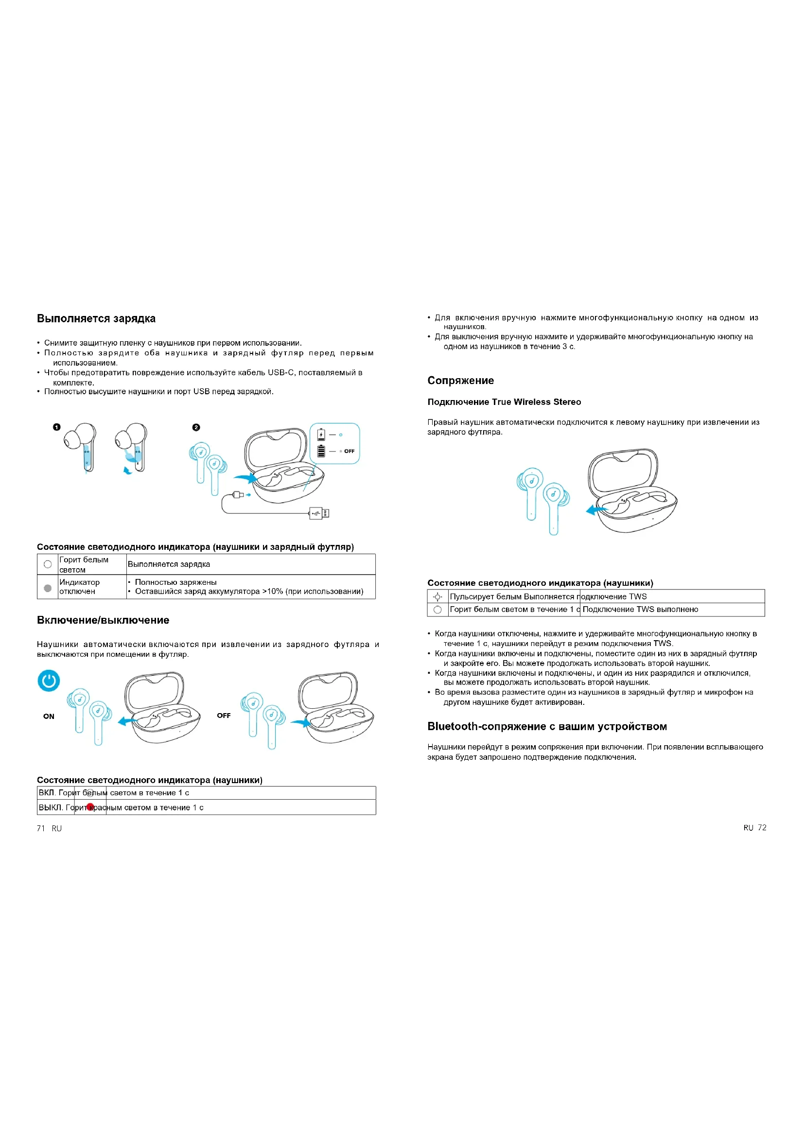 - Во время вызова разместите один из наушников в зарядный футляр и микрофон на другом наушнике будет активирован. Bluetooth-сопряжение с вашим устройством Наушники перейдут в режим сопряжения при включении. При появлении всплывающего экрана будет запрошено подтверждение подключения.73 RU RU 74 Soundcore Life P2 Bluetooth Pairing Request “Headset” would like to pair with your iPhone Cancel Pair Pair Состояние светодиодного индикатора (наушники) Мигает белым Выполняется сопряжение Bluetooth Горит белым светом в течение 1 с Bluetooth подключен В ходе процесса сопряжения для некоторых устройств, несовместимых с двойными основными-дополнительными именами сопряжения технологии Qualcomm True Wireless, может появится сообщение «не удалось установить подключение» при нажатии «Сопряжение» или даже может не появиться всплывающий экран. Это не будет препятствовать использованию. После успешного сопряжения основной наушник подключается к вашему устройству и передает сигнал на второй наушник, который не будет подключен к вашему устройству. В результате этого, список сопряжения Bluetooth на вашем устройстве может отображать только подключение одной стороны, а не обеих.