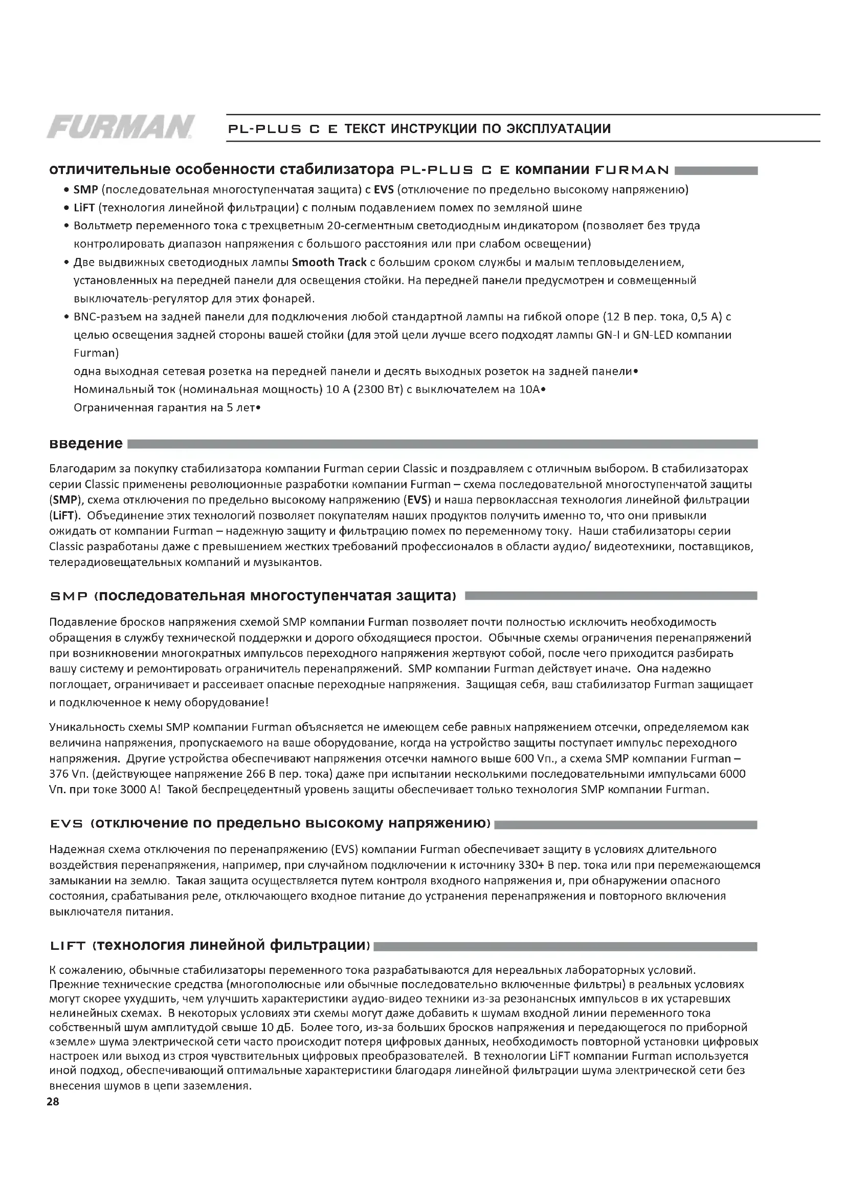 Благодарим за покупку стабилизатора компании Furman серии Classic и поздравляем с отличным выбором. В стабилизаторах серии Classic применены революционные разработки компании Furman – схема последовательной многоступенчатой защиты (SMP), схема отключения по предельно высокому напряжению (EVS) и наша первоклассная технология линейной фильтрации (LiFT). Объединение этих технологий позволяет покупателям наших продуктов получить именно то, что они привыкли ожидать от компании Furman – надежную защиту и фильтрацию помех по переменному току. Наши стабилизаторы серии Classic разработаны даже с превышением жестких требований профессионалов в области аудио/ видеотехники, поставщиков, телерадиовещательных компаний и музыкантов. SMP (последовательная многоступенчатая защита) Подавление бросков напряжения схемой SMP компании Furman позволяет почти полностью исключить необходимость обращения в службу технической поддержки и дорого обходящиеся простои. Обычные схемы ограничения перенапряжений при возникновении многократных импульсов переходного напряжения жертвуют собой, после чего приходится разбирать вашу систему и ремонтировать ограничитель перенапряжений. SMP компании Furman действует иначе. Она надежно поглощает, ограничивает и рассеивает опасные переходные напряжения. Защищая себя, ваш стабилизатор Furman защищает и подключенное к нему оборудование! Уникальность схемы SMP компании Furman объясняется не имеющем себе равных напряжением отсечки, определяемом как величина напряжения, пропускаемого на ваше оборудование, когда на устройство защиты поступает импульс переходного напряжения. Другие устройства обеспечивают напряжения отсечки намного выше 600 Vп., а схема SMP компании Furman – 376 Vп. (действующее напряжение 266 В пер. тока) даже при испытании несколькими последовательными импульсами 6000 Vп. при токе 3000 А! Такой беспрецедентный уровень защиты обеспечивает только технология SMP компании Furman. EVS (отключение по предельно высокому напряжению) Надежная схема отключения по перенапряжению (EVS) компании Furman обеспечивает защиту в условиях длительного воздействия перенапряжения, например, при случайном подключении к источнику 330+ В пер. тока или при перемежающемся замыкании на землю. Такая защита осуществляется путем контроля входного напряжения и, при обнаружении опасного состояния, срабатывания реле, отключающего входное питание до устранения перенапряжения и повторного включения выключателя питания. LIFT (технология линейной фильтрации) К сожалению, обычные стабилизаторы переменного тока разрабатываются для нереальных лабораторных условий. Прежние технические средства (многополюсные или обычные последовательно включенные фильтры) в реальных условиях могут скорее ухудшить, чем улучшить характеристики аудио-видео техники из-за резонансных импульсов в их устаревших нелинейных схемах. В некоторых условиях эти схемы могут даже добавить к шумам входной линии переменного тока собственный шум амплитудой свыше 10 дБ. Более того, из-за больших бросков напряжения и передающегося по приборной «земле» шума электрической сети часто происходит потеря цифровых данных, необходимость повторной установки цифровых настроек или выход из строя чувствительных цифровых преобразователей. В технологии LiFT компании Furman используется иной подход, обеспечивающий оптималь