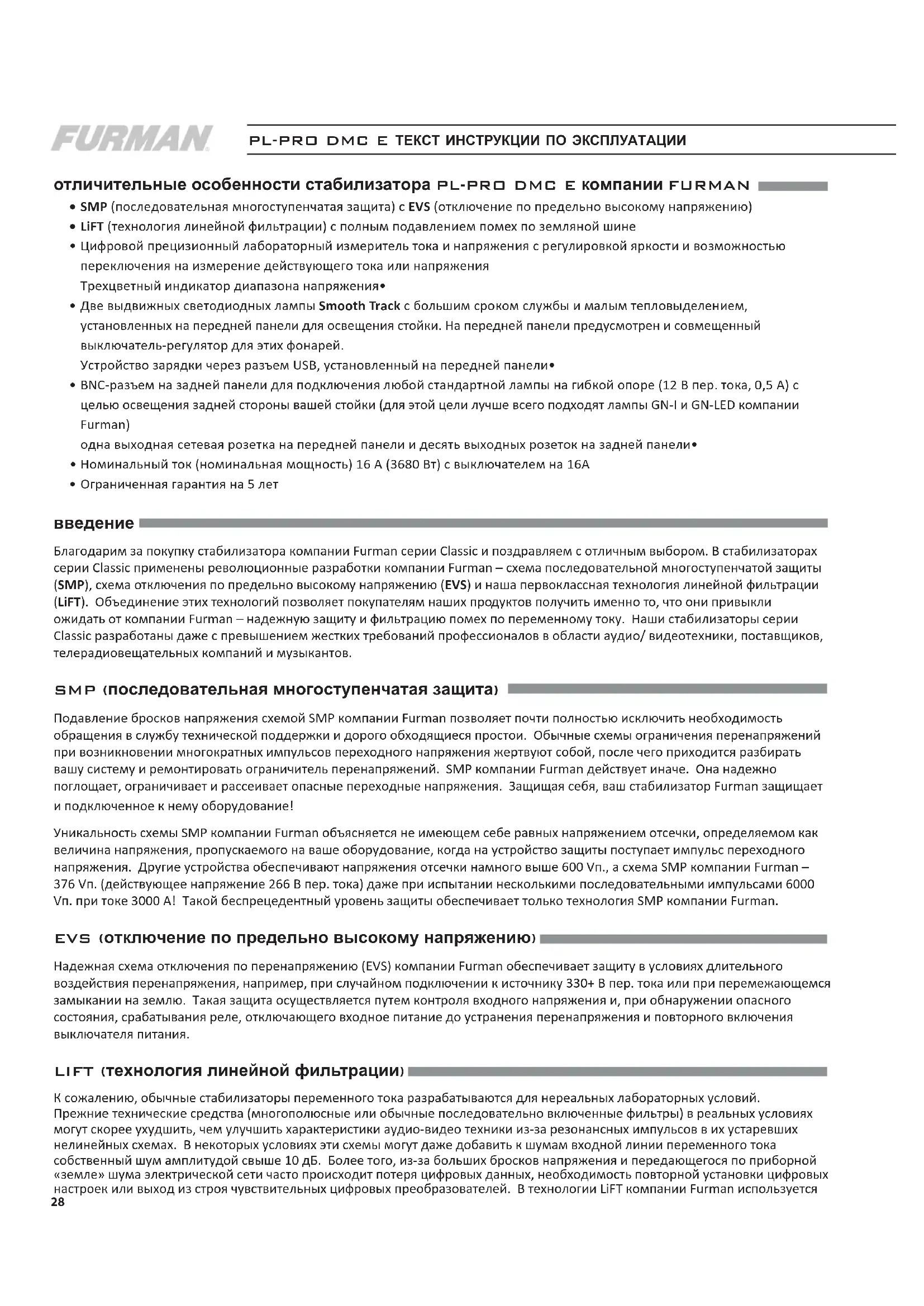 Благодарим за покупку стабилизатора компании Furman серии Classic и поздравляем с отличным выбором. В стабилизаторах серии Classic применены революционные разработки компании Furman – схема последовательной многоступенчатой защиты (SMP), схема отключения по предельно высокому напряжению (EVS) и наша первоклассная технология линейной фильтрации (LiFT). Объединение этих технологий позволяет покупателям наших продуктов получить именно то, что они привыкли ожидать от компании Furman – надежную защиту и фильтрацию помех по переменному току. Наши стабилизаторы серии Classic разработаны даже с превышением жестких требований профессионалов в области аудио/ видеотехники, поставщиков, телерадиовещательных компаний и музыкантов. SMP (последовательная многоступенчатая защита) Подавление бросков напряжения схемой SMP компании Furman позволяет почти полностью исключить необходимость обращения в службу технической поддержки и дорого обходящиеся простои. Обычные схемы ограничения перенапряжений при возникновении многократных импульсов переходного напряжения жертвуют собой, после чего приходится разбирать вашу систему и ремонтировать ограничитель перенапряжений. SMP компании Furman действует иначе. Она надежно поглощает, ограничивает и рассеивает опасные переходные напряжения. Защищая себя, ваш стабилизатор Furman защищает и подключенное к нему оборудование! Уникальность схемы SMP компании Furman объясняется не имеющем себе равных напряжением отсечки, определяемом как величина напряжения, пропускаемого на ваше оборудование, когда на устройство защиты поступает импульс переходного напряжения. Другие устройства обеспечивают напряжения отсечки намного выше 600 Vп., а схема SMP компании Furman – 376 Vп. (действующее напряжение 266 В пер. тока) даже при испытании несколькими последовательными импульсами 6000 Vп. при токе 3000 А! Такой беспрецедентный уровень защиты обеспечивает только технология SMP компании Furman. EVS (отключение по предельно высокому напряжению) Надежная схема отключения по перенапряжению (EVS) компании Furman обеспечивает защиту в условиях длительного воздействия перенапряжения, например, при случайном подключении к источнику 330+ В пер. тока или при перемежающемся замыкании на землю. Такая защита осуществляется путем контроля входного напряжения и, при обнаружении опасного состояния, срабатывания реле, отключающего входное питание до устранения перенапряжения и повторного включения выключателя питания. LIFT (технология линейной фильтрации) К сожалению, обычные стабилизаторы переменного тока разрабатываются для нереальных лабораторных условий. Прежние технические средства (многополюсные или обычные последовательно включенные фильтры) в реальных условиях могут скорее ухудшить, чем улучшить характеристики аудио-видео техники из-за резонансных импульсов в их устаревших нелинейных схемах. В некоторых условиях эти схемы могут даже добавить к шумам входной линии переменного тока собственный шум амплитудой свыше 10 дБ. Более того, из-за больших бросков напряжения и передающегося по приборной «земле» шума электрической сети часто происходит потеря цифровых данных, необходимость повторной установки цифровых настроек или выход из строя чувствительных цифровых преобразователей. В технологии LiFT компании Furman используется29 FRANÇAIS ENGLISH ESPAÑOL DEUTSCH