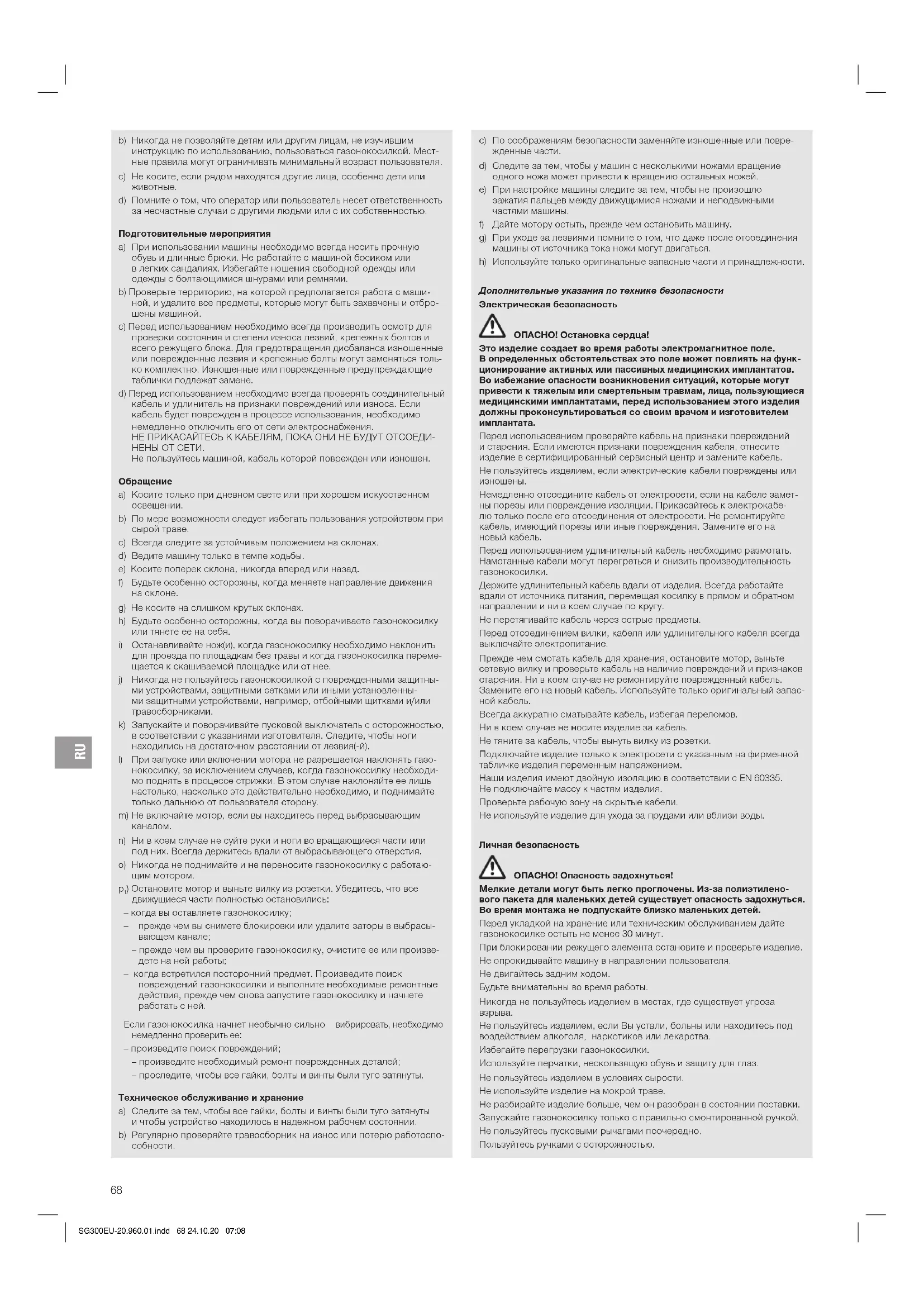 Не пользуйтесь изделием, если Вы устали, больныили находитесь под воздействием алкоголя, наркотиков или лекарства. Избегайте перегрузки газонокосилки. Используйте перчатки, нескользящую обувь и защиту для глаз. Не пользуйтесь изделием в условиях сырости. Не используйте изделие на мокрой траве. Не разбирайте изделие больше, чем он разобран всостоянии поставки. Запускайте газонокосилку только с правильно смонтированной ручкой. Не пользуйтесь пусковыми рычагами поочередно. Пользуйтесь ручками с осторожностью. SG300EU-20.960.01.indd 68 24.10.20 07:08RU