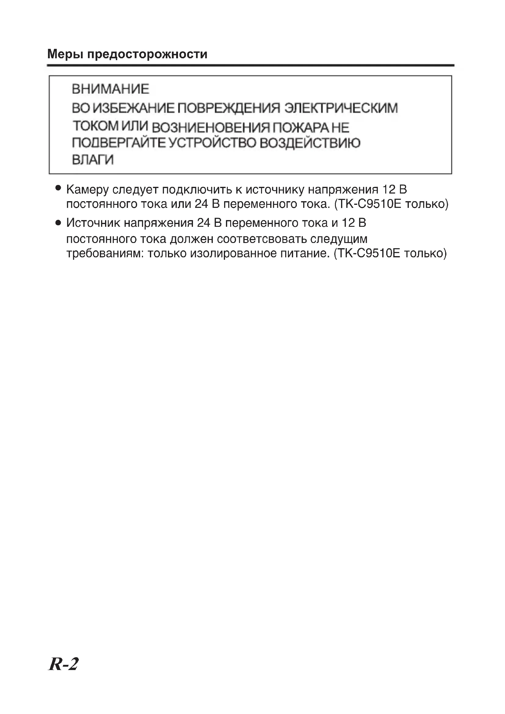 Камеру следует подключить к источнику напряжения 12 В постоянного тока или 24 В переменного тока. (TK-C9510E только) Источник напряжения 24 В переменного тока и 12 В постоянного тока должен соответсвовать следущим требованиям: только изолированное питание. (TK-C9510E только)