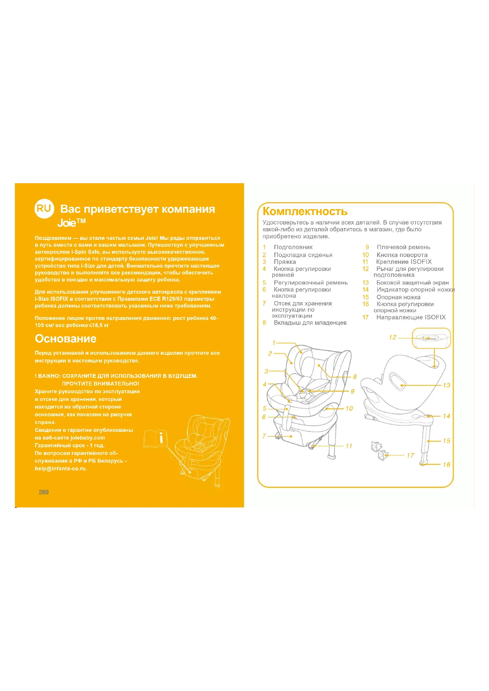 Вас приветствует компания Joie™ Поздравляем — вы стали частью семьи Joie! Мы рады отправиться в путь вместе с вами и вашим малышом. Путешествуя с улучшенным автокреслом i-Spin Safe, вы используете высококачественное, сертифицированное по стандарту безопасности удерживающее устройство типа i-Size для детей. Внимательно прочтите настоящее руководство и выполняйте все рекомендации, чтобы обеспечить удобство в поездке и максимальную защиту ребенка.Для использования улучшенного детского автокресла с креплением i-Size ISOFIX в соответствии с Правилами ECE R129/03 параметры ребенка должны соответствовать указанным ниже требованиям.Положение лицом против направления движения: рост ребенка 40–105 см/ вес ребенка18,5 кг Перед установкой и использованием данного изделия прочтите все инструкции в настоящем руководстве.! ВАЖНО: СОХРАНИТЕ ДЛЯ ИСПОЛЬЗОВАНИЯ В БУДУЩЕМ.ПРОЧТИТЕ ВНИМАТЕЛЬНО!Храните руководство по эксплуатации в отсеке для хранения, который находится на обратной стороне основания, как показано на рисунке справа.Сведения о гарантии опубликованы на веб-сайте joiebaby.comГарантийный срок - 1 год.По вопросам гарантийного об-служивания в РФ и РБ Беларусь - help@infanta-co.ru. Комплектность 1 Подголовник2 Подкладкасиденья3 Пряжка4 Кнопкарегулировкиремней5 Регулировочныйремень6 Кнопкарегулировкинаклона7 Отсекдляхраненияинструкциипоэксплуатации8 Вкладышдлямладенцев 9 Плечевойремень10 Кнопкаповорота11 КреплениеISOFIX12 Рычагдлярегулировкиподголовника13 Боковойзащитныйэкран14 Индикаторопорнойножки15 Опорнаяножка16 Кнопкарегулировкиопорнойножки17 НаправляющиеISOFIXУдостоверьтесьвналичиивсехдеталей.Вслучаеотсутствиякакой-либоиздеталейобратитесьвмагазин,гдебылоприобретеноизделие.