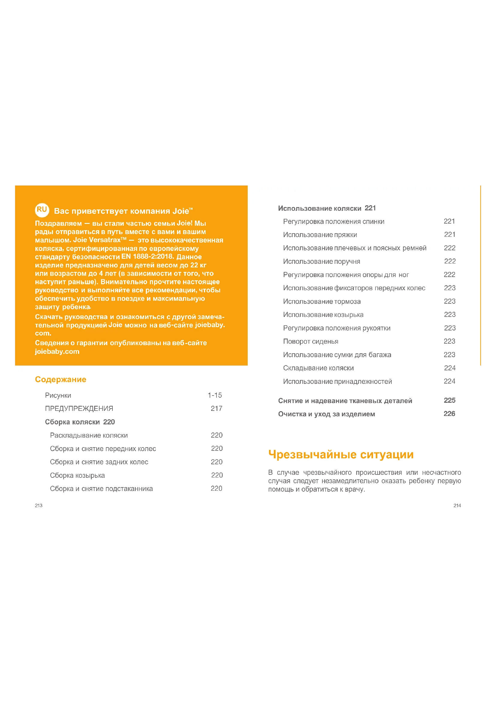 ! Вколяскедопускаетсяперевозитьдетейвесом0-22кг. Перевозкавколяскедетейбольшеговесаможетпривестик ееповреждению. ! Дляноворожденныхспинкуколяскирекомендуетсяопуститьв самоенизкоеположение. ! Передтемкакпомещатьребенкавколяскуилиизвлекатьего изколяски,необходимозадействоватьтормоза. ! Воизбежаниеопасногоопрокидыванияколяскинепомещайте ввещевуюкорзинупредметывесомболее4,5кг. ! Подстаканникрассчитаннамаксимальныйвес0,5кг(1фунт). ! Вколяскедопускаетсяперевозитьтолькоодногоребенка. ! Запрещаетсяприкреплятьразличныепредметык рукоятке,спинкесиденьяибоковымчастямколяски.От дополнительнойнагрузкиколяскапотеряетустойчивостьи можетперевернуться. ! Прикреплениелюбогогрузакрукоятке,кспинкеилибоковым частямколяскиприведеткнарушениюустойчивостиколяски. ! Неразрешаетсяиспользоватьпринадлежности,не одобренныепроизводителемколяски.Допускается использоватьтолькозапасныечасти,поставляемыеили рекомендованныепроизводителемколяски. ! Автолюлька,установленнаянарамуданнойколяски,не заменяетлюлькуиликроваткудляноворожденных.Чтобы уложитьребенкаспать,егонеобходимоперенестив подходящуюлежачуюколяску,люлькуиликровать. ! Воизбежаниеудушенияпередиспользованиемданного изделияснимитеснегопластиковыйпакетиупаковочные материалы.Хранитепластиковыйпакетиупаковочные материалывнедоступномдлядетейместе. ! Переноснаялюлькапредназначенатолькодлятехдетей, которыенемогутсамостоятельносидеть,переворачиватьсяи вставатьначетвереньки.Максимальныйвесребенка:9кг. ! ЗАПРЕЩАЕТСЯиспользоватьиукладыватьвлюлькуматрасы помимотого,которыйпоставляетсявкомплектесней. ! Сборкудолжныосуществлятьвзрослые. ! Передиспользованиемданногоизделияпрочтитевсе инструкциивнастоящемруководстве.Сохранитенастоящее руководствопоэксплуатациидляиспользованиявбудущем. Несоблюдениеэтихпредупрежденийиинструкцийможет привестикпричинениюсерьезноговредаздоровьюребенка илилетальномуисходу. ! Воизбежаниепричинениясерьезноговредаздоровью ребенкаврезультатепаденияиливыскальзыванияизколяски обязательноиспользуйтеремнибезопасности. ! Вовремярегулировкиколяскителоребенканедолжно соприкасатьсяскакимибытонибылоподвижнымидеталями. ! Категорическизапрещаетсяиспользоватьколяскуна лестницахиэскалаторах. ! Коляскунеобходимодержатьвдалиотгорячихпредметов, жидкостейиэлектронныхприборов. ! Категорическизапрещаетсяпомещатьколяскунадороги, откосыивдругиеопасныеместа. ! ВоизбежаниеудушенияЗАПРЕЩАЕТСЯпомещатьпредметы слентамииверевкамивокругшеиребенка. ! ЗАПРЕЩАЕТСЯпомещатьребенкаввещевуюкорзину.219