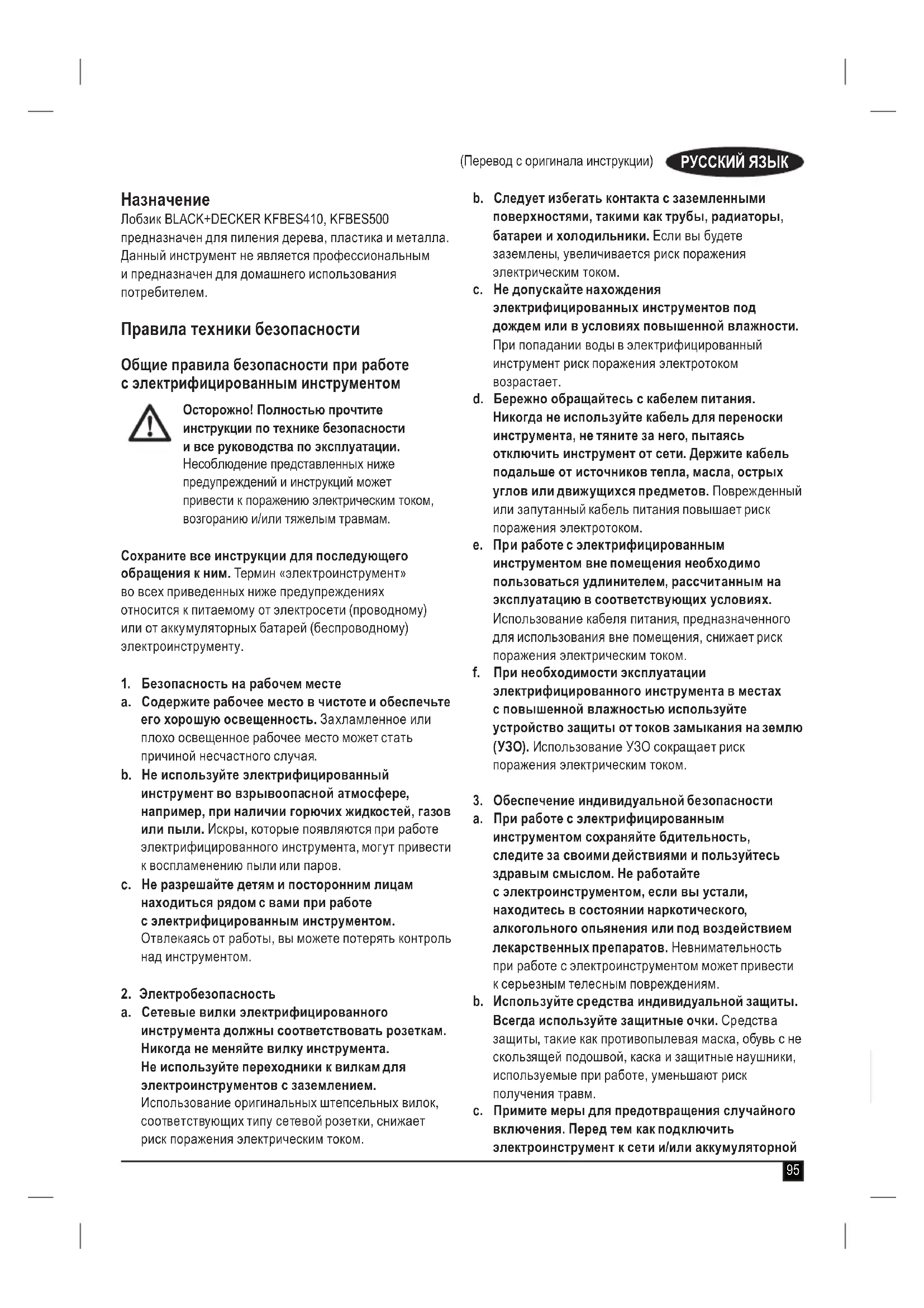 Лобзик BLACK+DECKER KFBES410, KFBES500 предназначен для пиления дерева, пластика и металла. Данный инструмент не является профессиональным и предназначен для домашнего использования потребителем. Правила техники безопасности Общие правила безопасности при работе с электрифицированным инструментом Осторожно! Полностью прочтите инструкции по технике безопасности и все руководства по эксплуатации. Несоблюдение представленных ниже предупреждений и инструкций может привести к поражению электрическим током, возгоранию и/или тяжелым травмам. Сохраните все инструкции для последующего обращения к ним. Термин «электроинструмент» во всех приведенных ниже предупреждениях относится к питаемому от электросети (проводному) или от аккумуляторных батарей (беспроводному) электроинструменту.