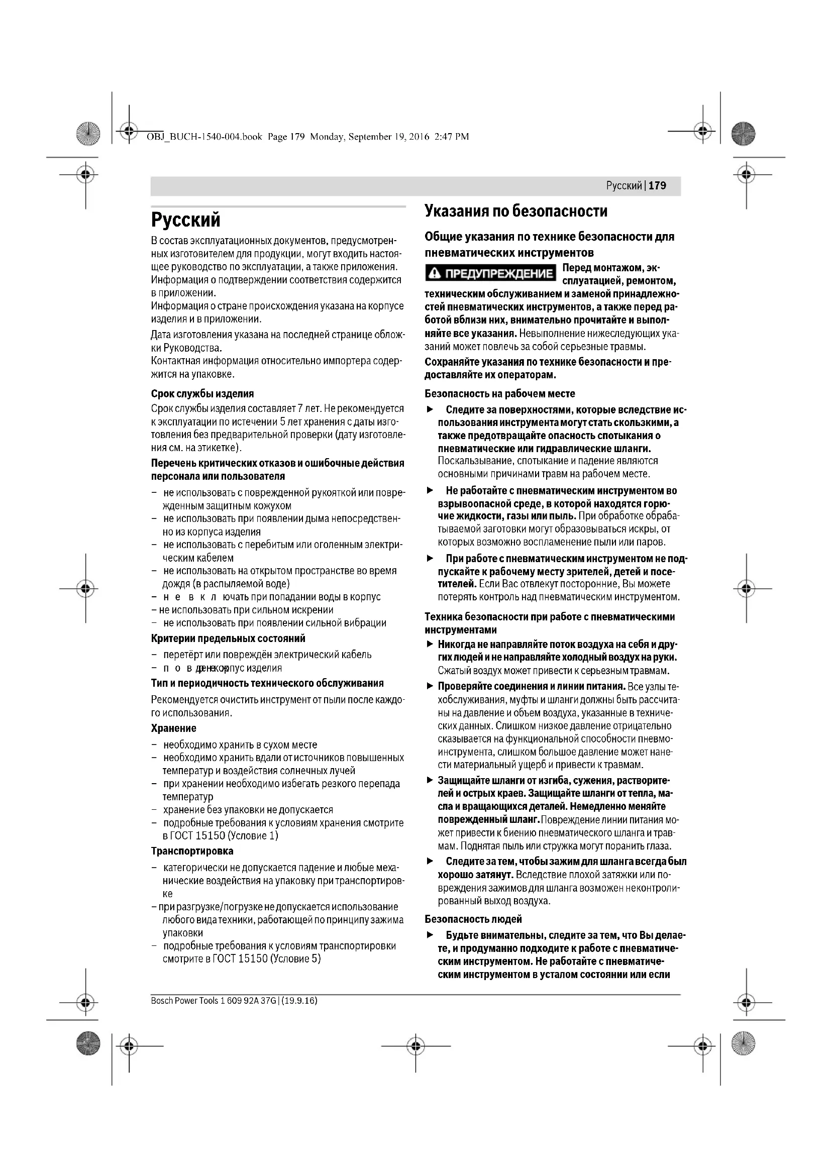 Ремонт Вашего пневмоинструмента поручайте только квалифицированному персоналу и только с использованием оригинальных запчастей. Этим обеспечивается безопасность пневмоинструмента в дальнейшем. Указания по технике безопасности для пневма- тических дрелей Следите за тем, чтобы данные, указанные на завод- ской табличке, были разборчивы. При необходимо- сти запросите у производителя новую табличку. OBJ_BUCH-1540-004.book Page 180 Monday, September 19, 2016 2:47 PMРусский | 181 Bosch Power Tools 1 609 92A 37G | (19.9.16) В случае поломки обрабатываемой заготовки, при- надлежности или самого пневматического инстру- мента обломки могут разлетаться с высокой скоро-