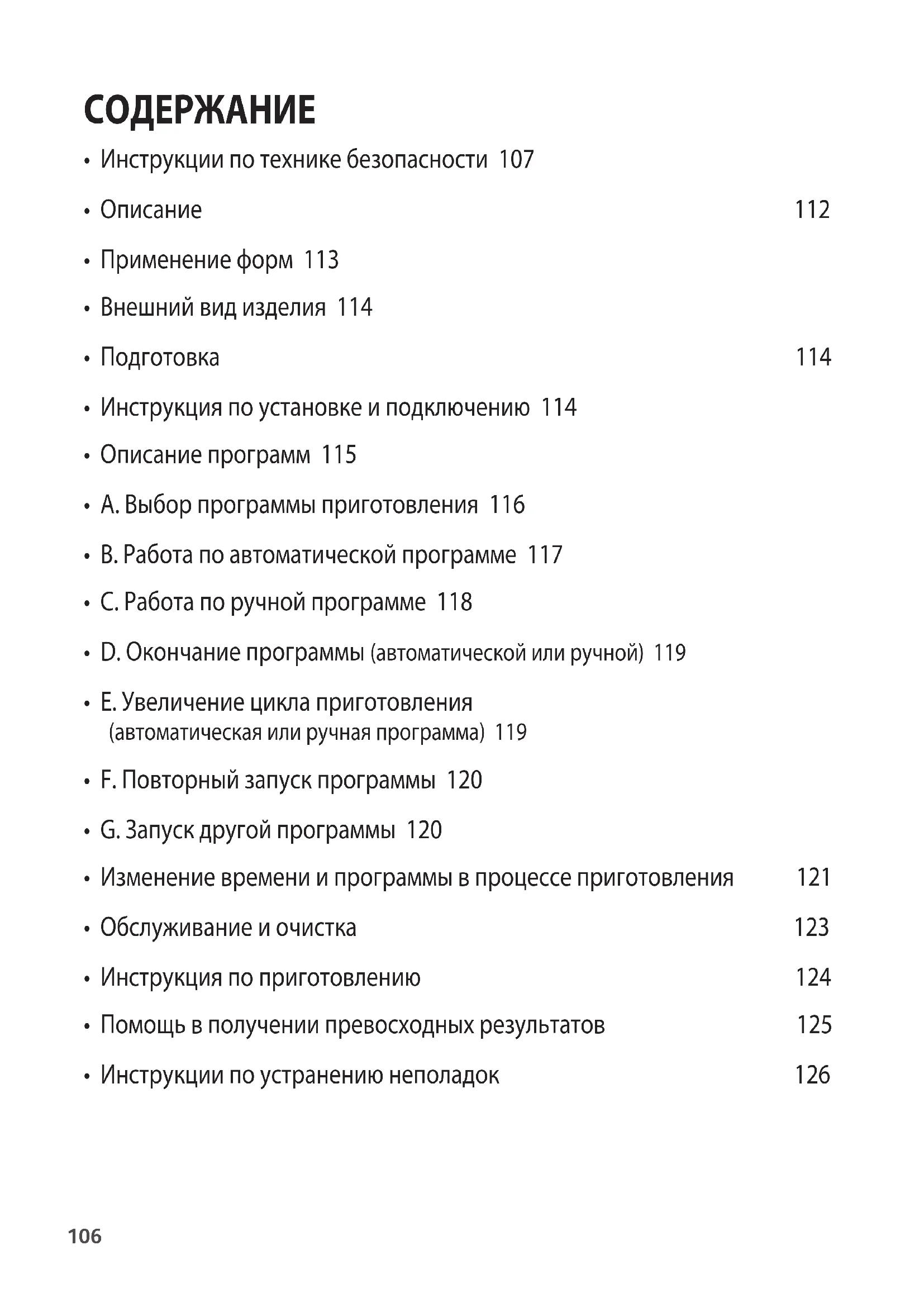 - Инструкции по устранению неполадок 126 106Инструкции по технике безопасности ВАЖНЫЕ МЕРЫ ПРЕДОСТОРОЖНОСТИ Эксплуатация, обслуживание и установка устройства: в целях обеспечения безопасности изучите все разделы данного руководства, включая рисунки. Устройство предназначено только для бытового использования. Устройство не предназначено для использования в нижеприведенных случаях, гарантия на которые не распространяется. – В кухонных помещениях, предназначенных для персонала магазинов, в офисах и в других рабочих помещениях. – На фермах. – Использование клиентами в гостиницах, мотелях и других жилых помещениях такого типа. – В мини-гостиницах. Удалите все упаковочные материалы, наклейки и принадлежности изнутри и снаружи устройства. Устройство не предназначено для использования людьми с ограниченными физическими и умственными способностями (включая детей), а также людьми, не имеющими соответствующего опыта или необходимых знаний. Указанные лица могут использовать данное устройство только под наблюдением или после получения инструкций по его эксплуатации от лиц, 107отвечающих за их безопасность. Следите за тем, чтобы дети не играли с устройством. Не оставляйте устройство без присмотра. Во время работы устройства открытые поверхности могут сильно нагреваться. Не прикасайтесь к горячим поверхностям. Устройство не предназначено для включения с помощью внешнего таймера или отдельной системы дистанционного управления. Полностью размотайте шнур. Если электрический шнур поврежден, во избежание несчастных случаев он должен быть заменен производителем, его гарантийной службой или специалистом аналогичной квалификации. В случае использования удлинительного шнура сечение его проводов не должно быть меньше, чем у шнура питания, а также удлинитель должен оснащаться заземляющим проводом. Примите меры предосторожности, чтобы никто не мог споткнуться о