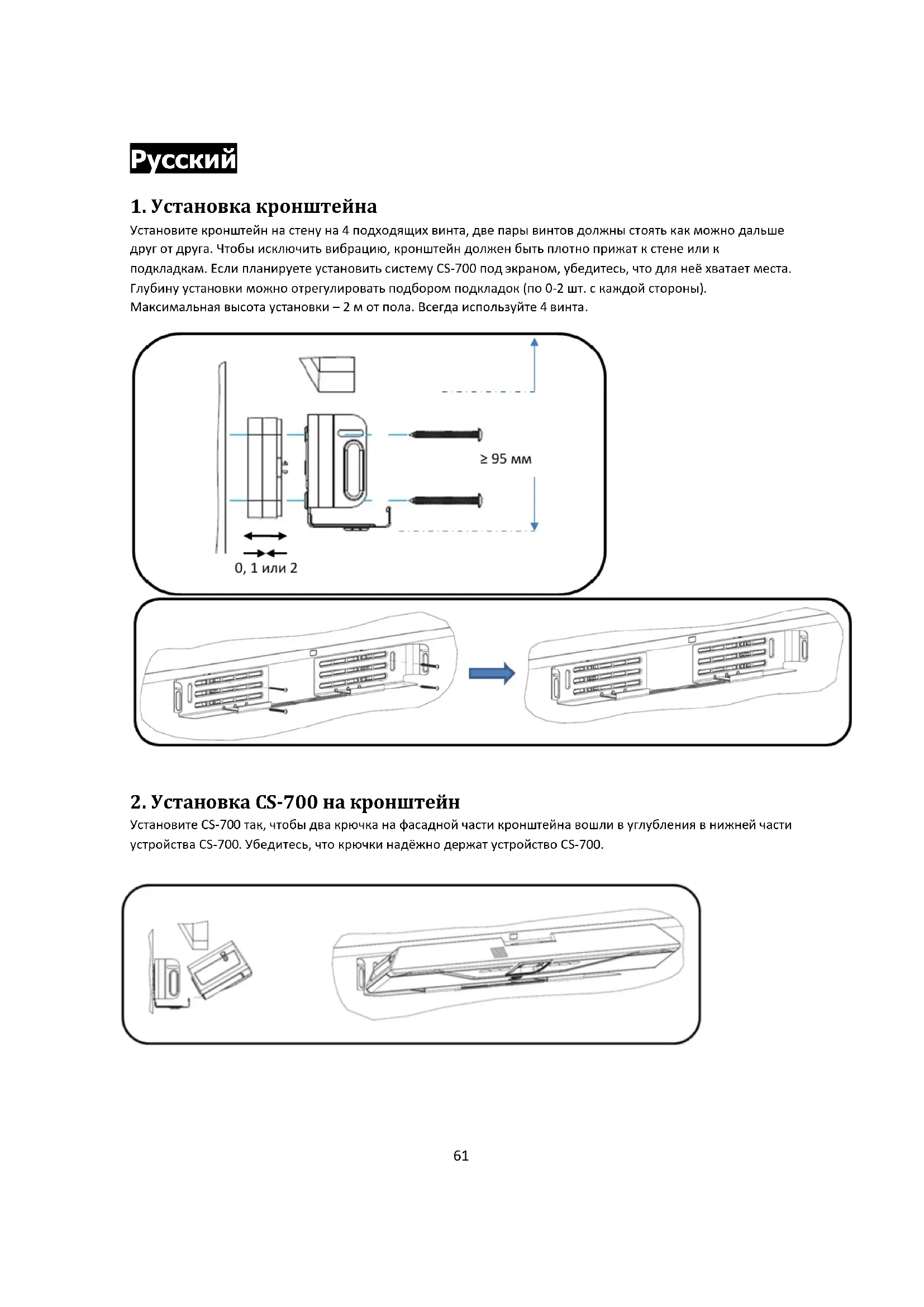 Установите кронштейн на стену на 4 подходящих винта, две пары винтов должны стоять как можно дальше друг от друга. Чтобы исключить вибрацию, кронштейн должен быть плотно прижат к стене или к подкладкам. Если планируете установить систему CS-700 под экраном, убедитесь, что для неё хватает места. Глубину установки можно отрегулировать подбором подкладок (по 0-2 шт. с каждой стороны). Максимальная высота установки – 2 м от пола. Всегда используйте 4 винта.