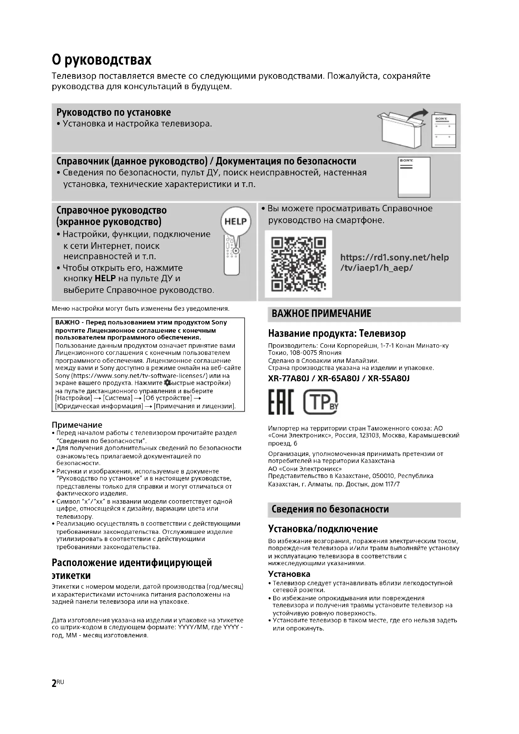 - Вы можете просматривать Справочное руководство на смартфоне. https://rd1.sony.net/help /tv/iaep1/h_aep/ ВАЖНО - Перед пользованием этим продуктом Sony прочтите Лицензионное соглашение с конечным пользователем программного обеспечения. Пользование данным продуктом означает принятие вами Лицензионного соглашения с конечным пользователем программного обеспечения. Лицензионное соглашение между вами и Sony доступно в режиме онлайн на веб-сайте Sony (https://www.sony.net/tv-software-licenses/) или на экране вашего продукта. Нажмите (Быстрые настройки) на пульте дистанционного управления и выберите [Настройки] t [Система] t [Об устройстве] t [Юридическая информация] t [Примечания и лицензии].D:\SONY TV\SY21_AT_CEP_RG_111\5026345111\20RU\5026345111_20RU.fm master page: Right XR-77A8xJ / 65A8xJ / 55A8xJ 5-026-345-11(1)