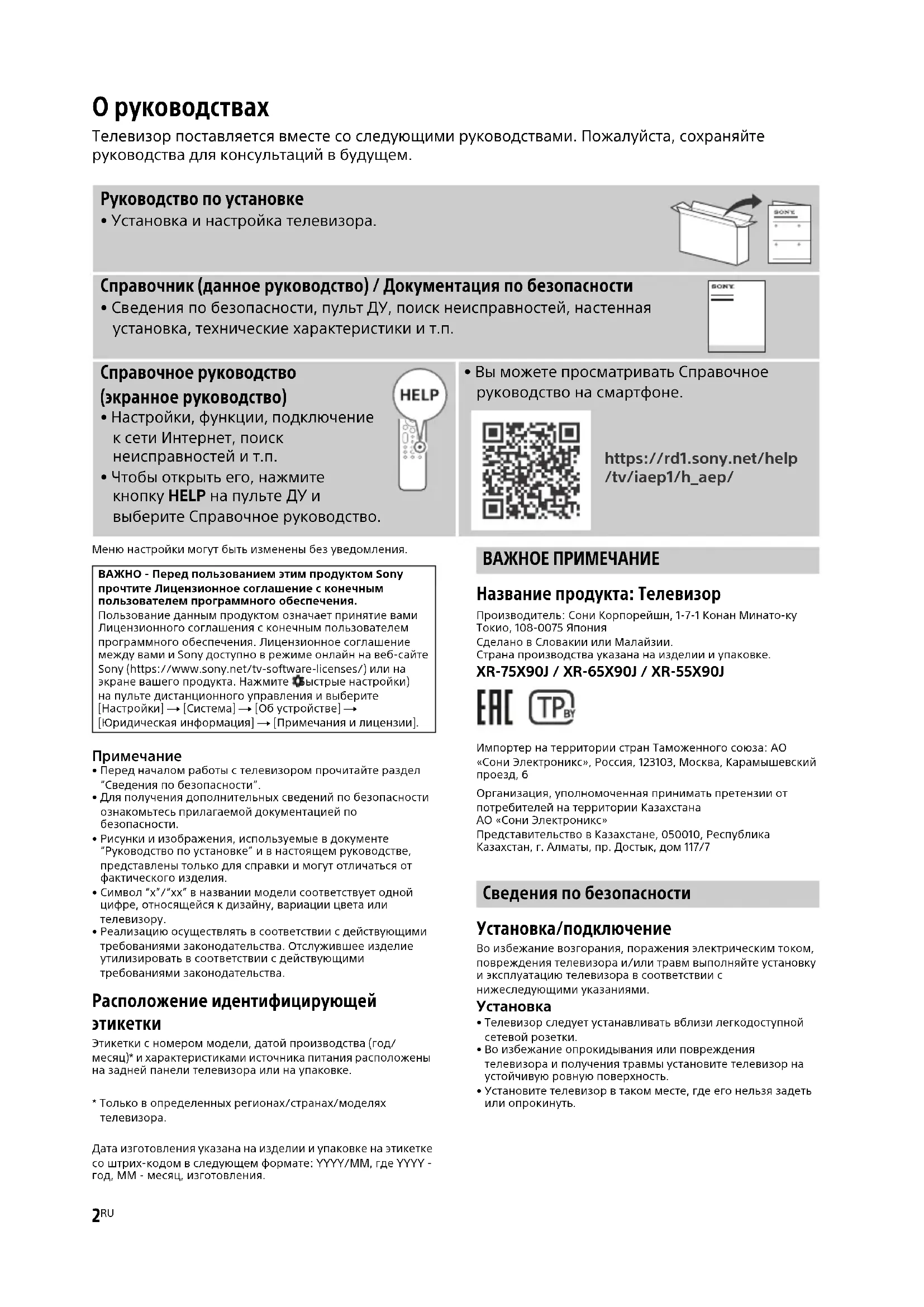 Этикетки с номером модели, датой производства (год/месяц)* и характеристиками источника питания расположены на задней панели телевизора или на упаковке.* Только в определенных регионах/странах/моделях телевизора.Дата изготовления указана на изделии и упаковке на этикетке со штрих-кодом в следующем формате: YYYY/MM, где YYYY - год, MM - месяц, изготовления. ВАЖНОЕ ПРИМЕЧАНИЕ Название продукта: Телевизор Производитель: Сони Корпорейшн, 1-7-1 Конан Минато-ку Токио, 108-0075 ЯпонияСделано в Словакии или Малайзии.Страна производства указана на изделии и упаковке. XR-75X90J / XR-65X90J / XR-55X90J Импортер на территории стран Таможенного союза: АО «Сони Электроникс», Россия, 123103, Москва, Карамышевский проезд, 6Организация, уполномоченная принимать претензии от потребителей на территории КазахстанаАО «Сони Электроникс»Представительство в Казахстане, 050010, Республика Казахстан, г. Алматы, пр. Достык, дом 117/7 Сведения по безопасности Установка/подключение Во избежание возгорания, поражения электрическим током, повреждения телевизора и/или травм выполняйте установку и эксплуатацию телевизора в соответствии с нижеследующими указаниями.