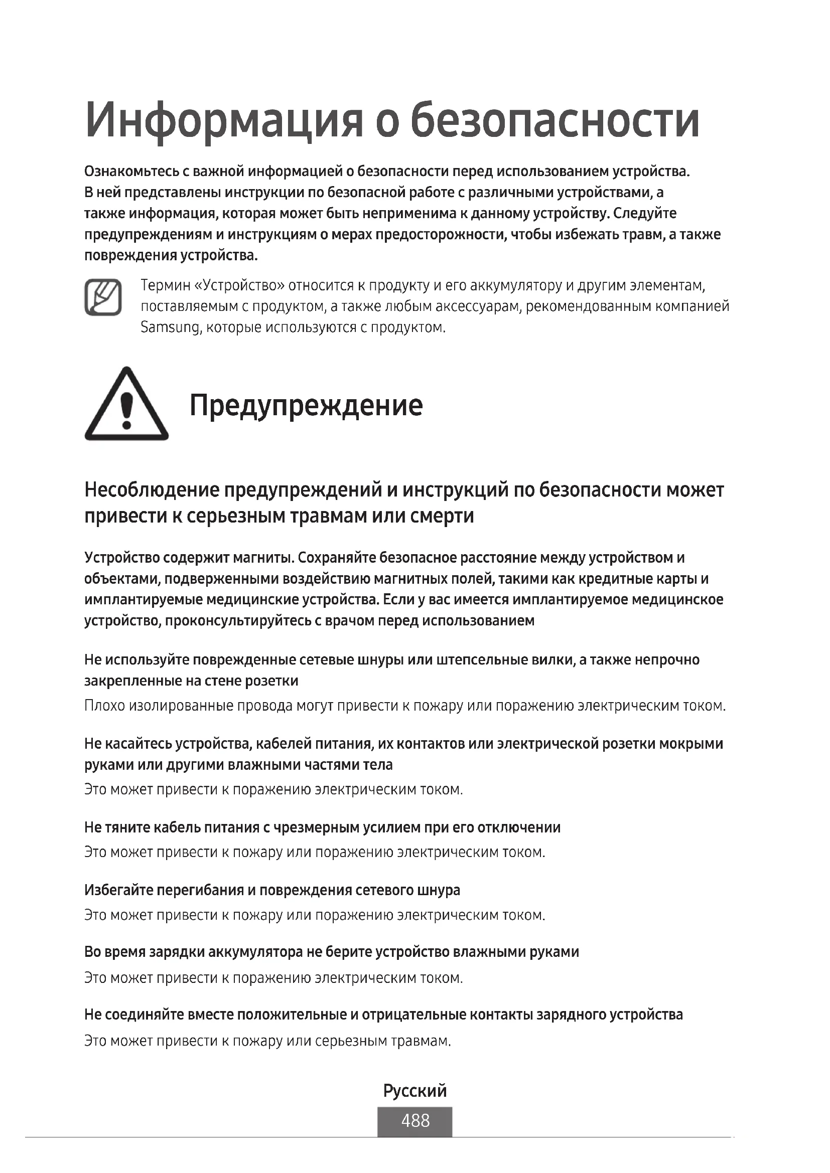 Информация о безопасности Ознакомьтесь с важной информацией о безопасности перед использованием устройства. В ней представлены инструкции по безопасной работе с различными устройствами, а также информация, которая может быть неприменима к данному устройству. Следуйте предупреждениям и инструкциям о мерах предосторожности, чтобы избежать травм, а также повреждения устройства. Термин «Устройство» относится к продукту и его аккумулятору и другим элементам, поставляемым с продуктом, а также любым аксессуарам, рекомендованным компанией Samsung, которые используются с продуктом. Предупреждение Несоблюдение предупреждений и инструкций по безопасности может привести к серьезным травмам или смерти Устройство содержит магниты. Сохраняйте безопасное расстояние между устройством и объектами, подверженными воздействию магнитных полей, такими как кредитные карты и имплантируемые медицинские устройства. Если у вас имеется имплантируемое медицинское устройство, проконсультируйтесь с врачом перед использованием Не используйте поврежденные сетевые шнуры или штепсельные вилки, а также непрочно закрепленные на стене розетки Плохо изолированные провода могут привести к пожару или поражению электрическим током. Не касайтесь устройства, кабелей питания, их контактов или электрической розетки мокрыми руками или другими влажными частями тела Это может привести к поражению электрическим током. Не тяните кабель питания с чрезмерным усилием при его отключении Это может привести к пожару или поражению электрическим током. Избегайте перегибания и повреждения сетевого шнура Это может привести к пожару или поражению электрическим током. Во время зарядки аккумулятора не берите устройство влажными руками Это может привести к поражению электрическим током. Не соединяйте вместе положительные и отрицательные контакты зарядного устройства Это может привести к пожару или серьезным травмам.Русский