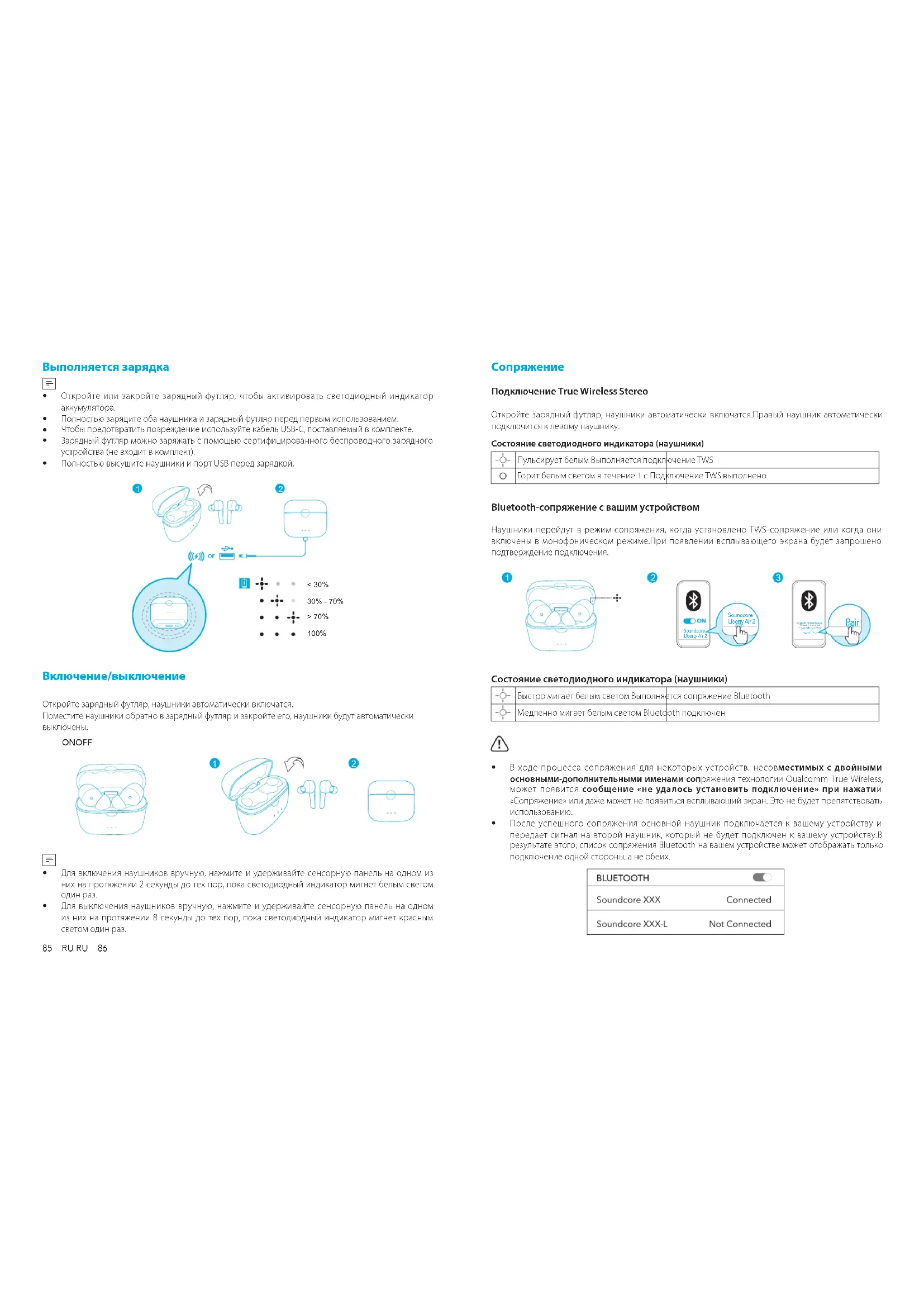 После успешного сопряжения основной наушник подключается к вашему устройству и передает сигнал на второй наушник, который не будет подключен к вашему устройству.В результате этого, список сопряжения Bluetooth на вашем устройстве может отображать только подключение одной стороны, а не обеих.87 RU RU 88 Для сопряжения с другим Bluetooth-устройством поместите наушники обратно в зарядный футляр и убедитесь, что они заряжены, держите крышку открытой, затем нажмите и удерживайте кнопку на нижней части зарядного футляра в течение 3 секунды до тех пор, пока светодиодные индикаторы на наушниках не начнут быстро мигать белым светом.