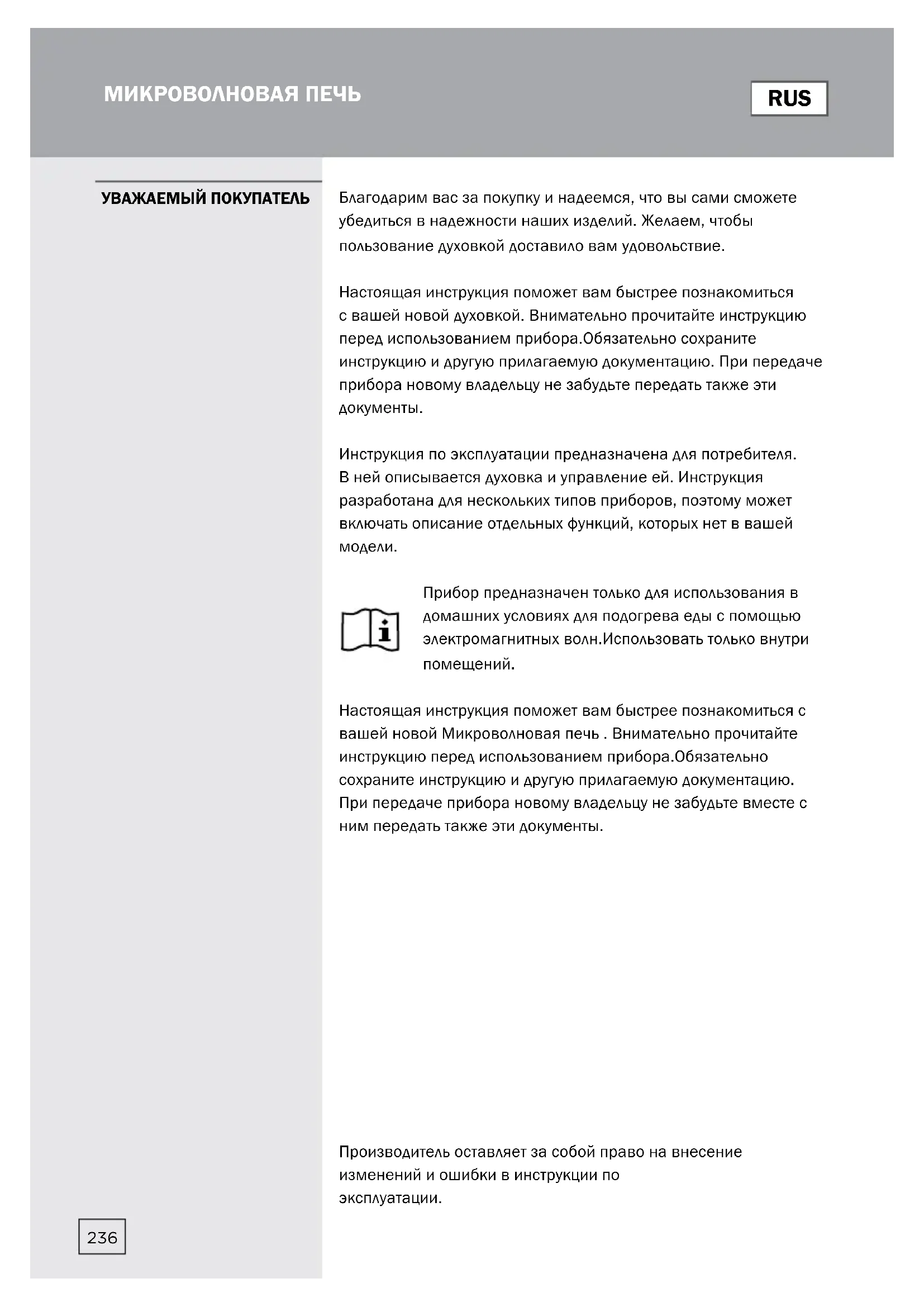 Настоящая инструкция поможет вам быстрее познакомиться с вашей новой Микроволновая печь . Внимательно прочитайте инструкцию перед использованием прибора.Обязательно сохраните инструкцию и другую прилагаемую документацию. При передаче прибора новому владельцу не забудьте вместе с ним передать также эти документы. Производитель оставляет за собой право на внесение изменений и ошибки в инструкции по эксплуатации. УВАЖАЕМЫЙ ПОКУПАТЕЛЬ RUS МИКРОВОЛНОВАЯ ПЕЧЬ237 Не прикасайтесь к поверхностям приборов и их нагревательным элементам во время приготовления. При работе поверхности нагреваются. Держите детей на безопасном расстоянии. Есть риск возникновения ожогов. Источник микроволновой энергии. Высокое напряжение. Не снимать крышку. Внимание прибор и его детали нагреваются во время использования. Будьте осторожны, не дотрагивайтесь до нагревательных элементов. Детям, младше 8 лет, запрещается пользоваться данным прибором без постоянного контроля взрослых. Следите за тем, чтобы дети не играли с прибором. Этим прибором могут пользоваться дети, старше 8 лет; лица с ограниченными физическими, чувствительными и умственными способностями; лица, не имеющие опыта работы с устройством и не знающие как им пользоваться только под контролем и руководством лиц, обеспечивающих безопасное использование и связанных с ним рисков. Следите, чтобы дети не играли с прибором. Чистка и обслуживание не должны проводиться детьми младше 8 лет, либо под контролем взрослых. Храните прибор и его сетевой шнур в недоступном для детей месте.