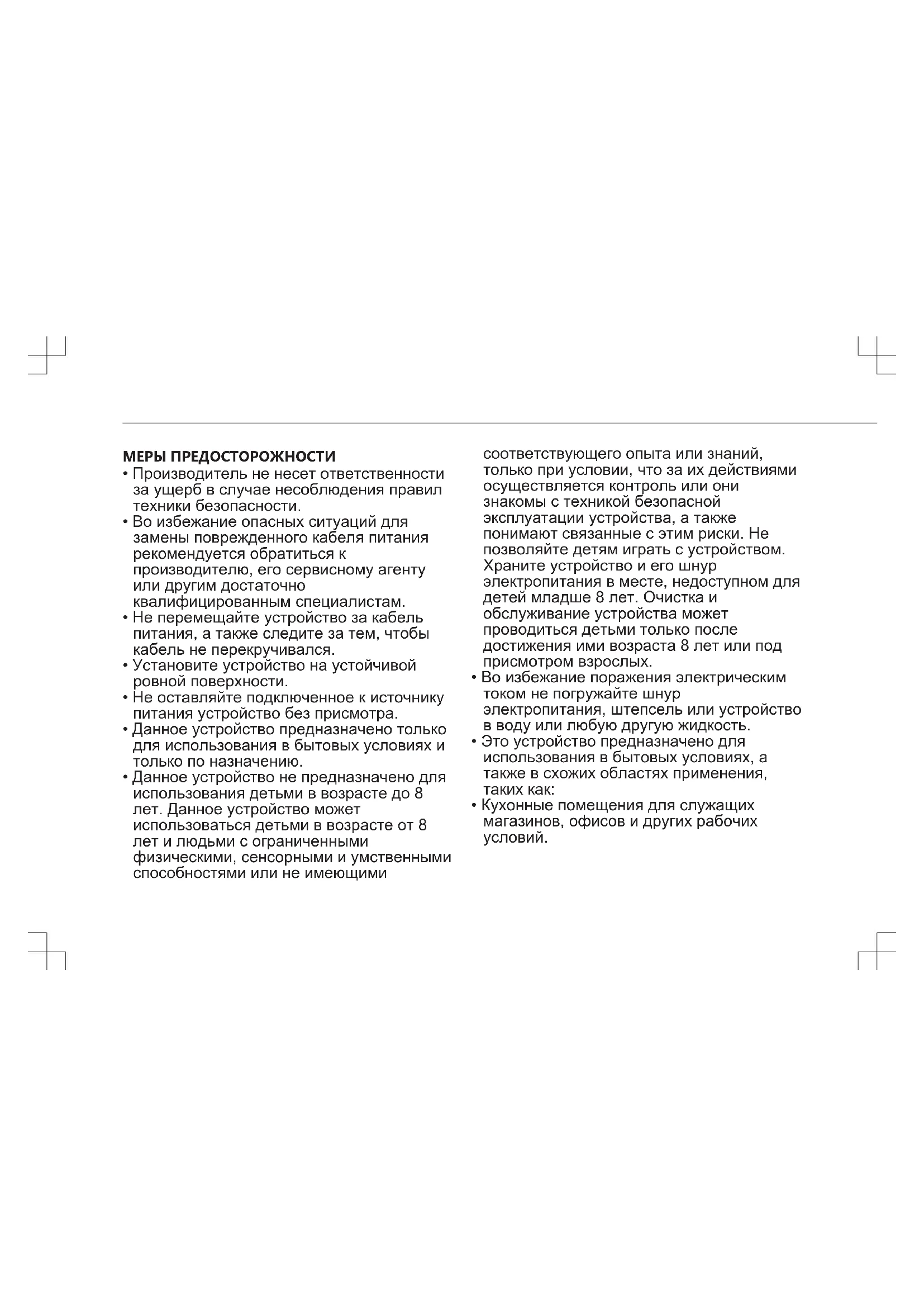 - Данное устройство не предназначено для использования детьми в возрасте до 8 лет. Данное устройство может использоваться детьми в возрасте от 8 лет и людьми с ограниченными физическими, сенсорными и умственными способностями или не имеющими соответствующего опыта или знаний, только при условии, что за их действиями осуществляется контроль или они знакомы с техникой безопасной эксплуатации устройства, а также понимают связанные с этим риски. Не позволяйте детям играть с устройством. Храните устройство и его шнур электропитания в месте, недоступном для детей младше 8 лет. Очистка и обслуживание устройства может проводиться детьми только после достижения ими возраста 8 лет или под присмотром взрослых.
