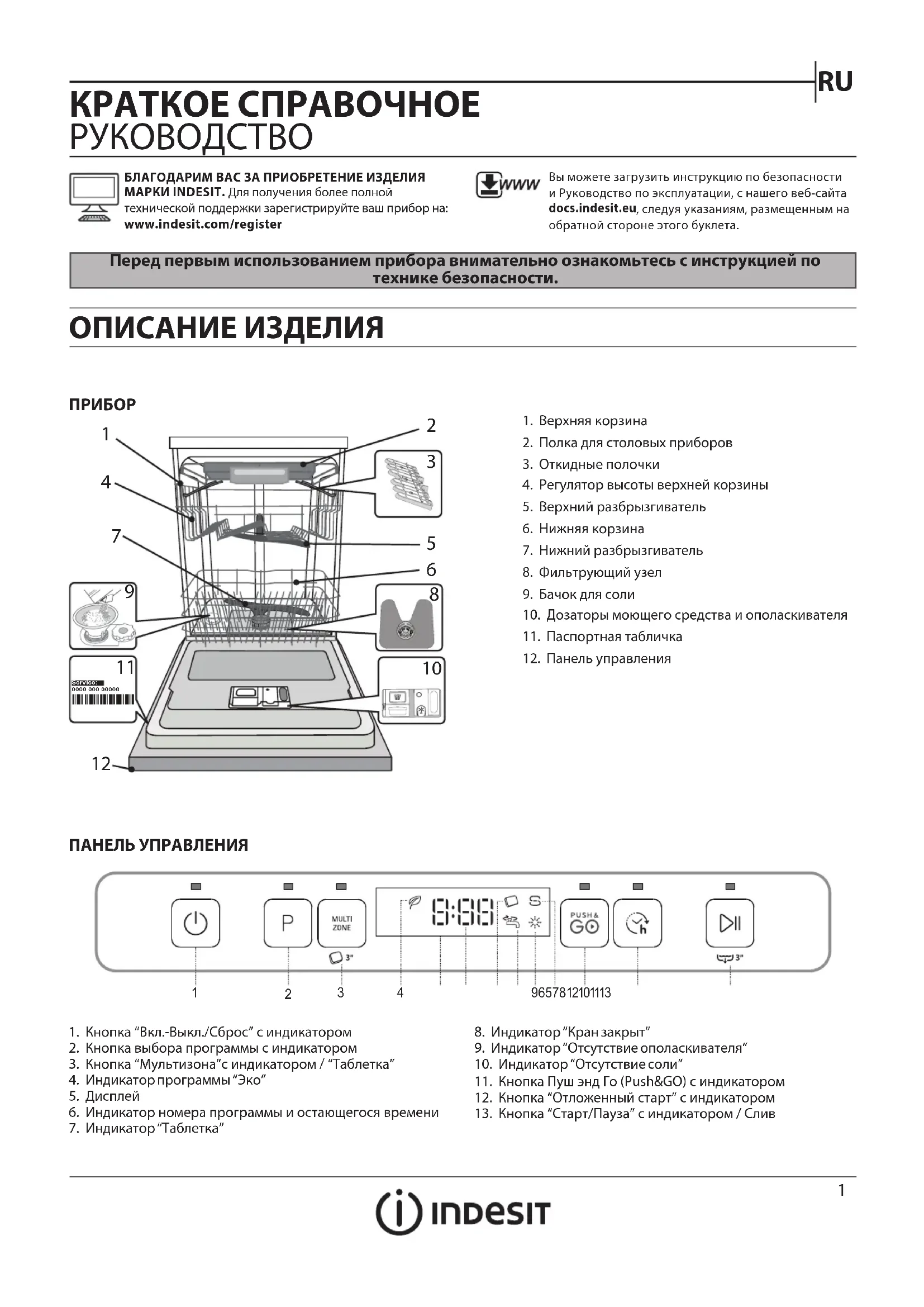 1. Кнопка “Вкл.-Выкл./Сброс” с индикатором2. Кнопка выбора программы с индикатором3. Кнопка “Мультизона”с индикатором / “Таблетка”4. Индикатор программы “Эко”5. Дисплей6. Индикатор номера программы и остающегося времени7. Индикатор “Таблетка” КРАТКОЕ СПРАВОЧНОЕ РУКОВОДСТВО ПАНЕЛЬ УПРАВЛЕНИЯ 8. Индикатор “Кран закрыт”9. Индикатор “Отсутствие ополаскивателя”10. Индикатор “Отсутствие соли”11. Кнопка Пуш энд Го (Push&GO) с индикатором12. Кнопка “Отложенный старт” с индикатором13. Кнопка “Старт/Пауза” с индикатором / Слив ОПИСАНИЕ ИЗДЕЛИЯ