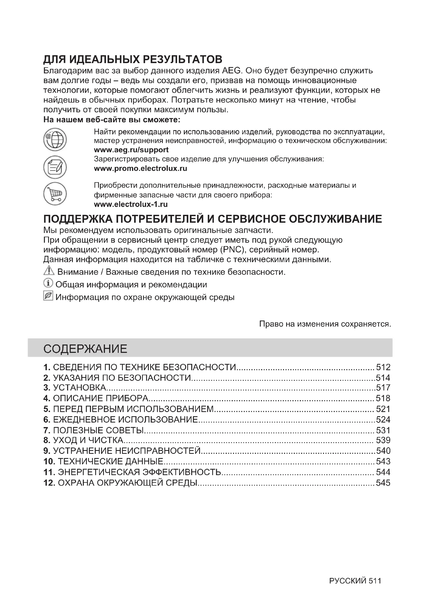 МАКЕДОНСКИ 50912. ГРИЖА ЗА ОКОЛИНАТА Рециклирајте ги материјалите со симболот . Ставете ја амбалажата во соодветни контејнери за да ја рециклирате. Помогнете во заштитата на живтната средина и човековото здравје и рециклирајте го отпадот од електрични и електронски апарати. Не фрлајте ги апаратите озанчени со симболот во отпадот од домаќинството. Вратете го производот во вашиот локален капацитет за рециклирање или контактирајте ја вашата општинска канцеларија. 510 МАКЕДОНСКИДЛЯ ИДЕАЛЬНЫХ РЕЗУЛЬТАТОВ Благодарим вас за выбор данного изделия AEG. Оно будет безупречно служить вам долгие годы – ведь мы создали его, призвав на помощь инновационные технологии, которые помогают облегчить жизнь и реализуют функции, которых не найдешь в обычных приборах. Потратьте несколько минут на чтение, чтобы получить от своей покупки максимум пользы. На нашем веб-сайте вы сможете: Найти рекомендации по использованию изделий, руководства по эксплуатации, мастер устранения неисправностей, информацию о техническом обслуживании: www.aeg.ru/support Зарегистрировать свое изделие для улучшения обслуживания: www.promo.electrolux.ru Приобрести дополнительные принадлежности, расходные материалы и фирменные запасные части для своего прибора: www.electrolux-1.ru ПОДДЕРЖКА ПОТРЕБИТЕЛЕЙ И СЕРВИСНОЕ ОБСЛУЖИВАНИЕ Мы рекомендуем использовать оригинальные запчасти. При обращении в сервисный центр следует иметь под рукой следующую информацию: модель, продуктовый номер (PNC), серийный номер. Данная информация находится на табличке с техническими данными. Внимание / Важные сведения по технике безопасности. Общая информация и рекомендации Информация по охране окружающей среды Право на изменения сохраняется.