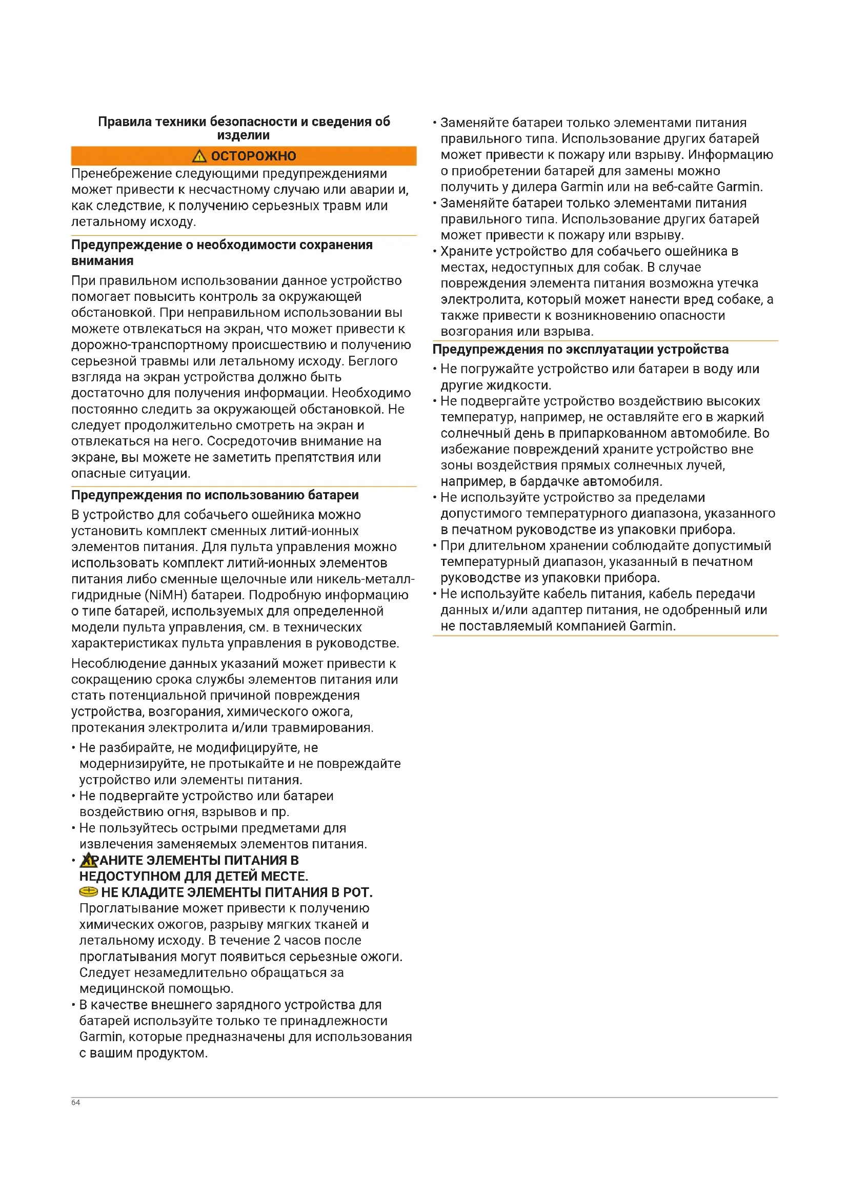 При правильном использовании данное устройство помогает повысить контроль за окружающей обстановкой. При неправильном использовании вы можете отвлекаться на экран, что может привести к дорожно-транспортному происшествию и получению серьезной травмы или летальному исходу. Беглого взгляда на экран устройства должно быть достаточно для получения информации. Необходимо постоянно следить за окружающей обстановкой. Не следует продолжительно смотреть на экран и отвлекаться на него. Сосредоточив внимание на экране, вы можете не заметить препятствия или опасные ситуации. Предупреждения по использованию батареи В устройство для собачьего ошейника можно установить комплект сменных литий-ионных элементов питания. Для пульта управления можно использовать комплект литий-ионных элементов питания либо сменные щелочные или никель-металл- гидридные (NiMH) батареи. Подробную информацию о типе батарей, используемых для определенной модели пульта управления, см. в технических характеристиках пульта управления в руководстве. Несоблюдение данных указаний может привести к сокращению срока службы элементов питания или стать потенциальной причиной повреждения устройства, возгорания, химического ожога, протекания электролита и/или травмирования.