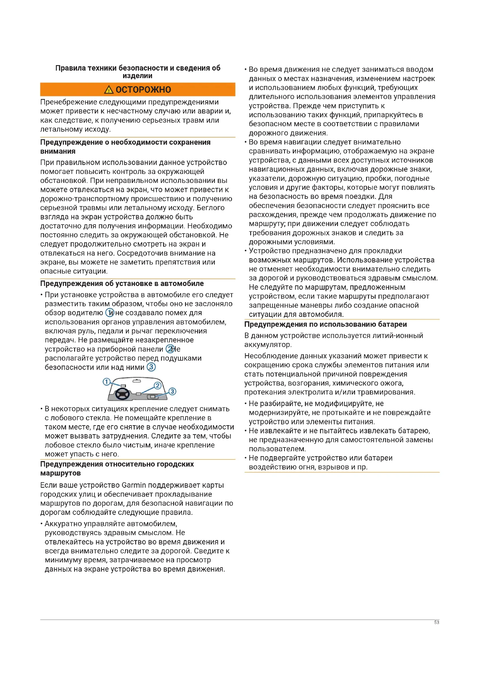 - Устройство предназначено для прокладки возможных маршрутов. Использование устройства не отменяет необходимости внимательно следить за дорогой и руководствоваться здравым смыслом. Не следуйте по маршрутам, предложенным устройством, если такие маршруты предполагают запрещенные маневры либо создание опасной ситуации для автомобиля. Предупреждения по использованию батареи В данном устройстве используется литий-ионный аккумулятор. Несоблюдение данных указаний может привести к сокращению срока службы элементов питания или стать потенциальной причиной повреждения устройства, возгорания, химического ожога, протекания электролита и/или травмирования.