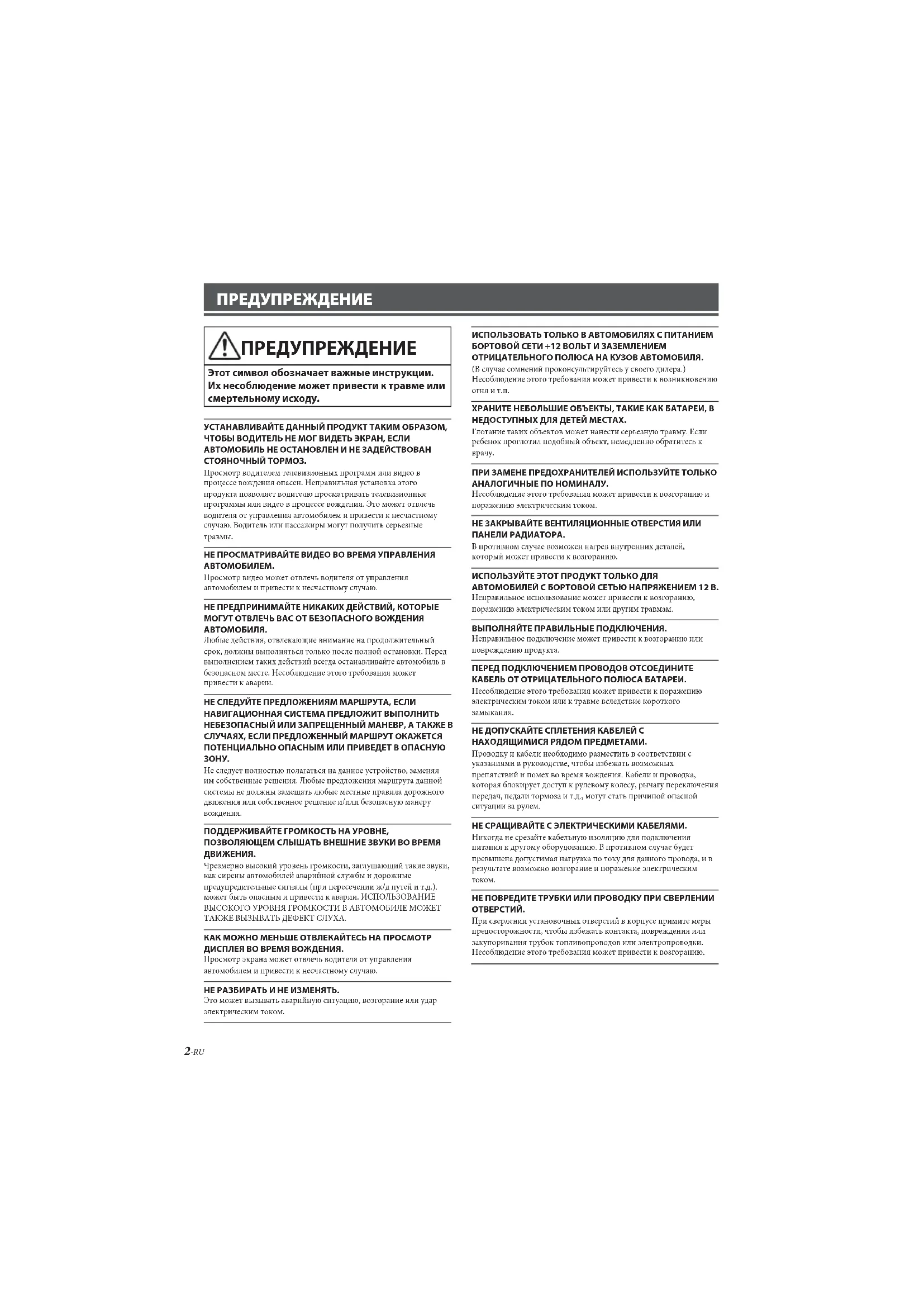 Чрезмерно высокий уровень громкости, заглушающий такие звуки, как сирены автомобилей аварийной службы и дорожные предупредительные сигналы (при пересечении ж/д путей и т.д.), может быть опасным и привести к аварии. ИСПОЛЬЗОВАНИЕ ВЫСОКОГО УРОВНЯ ГРОМКОСТИ В АВТОМОБИЛЕ МОЖЕТ ТАКЖЕ ВЫЗЫВАТЬ ДЕФЕКТ СЛУХА. КАК МОЖНО МЕНЬШЕ ОТВЛЕКАЙТЕСЬ НА ПРОСМОТР ДИСПЛЕЯ ВО ВРЕМЯ ВОЖДЕНИЯ. Просмотр экрана может отвлечь водителя от управления автомобилем и привести к несчастному случаю. НЕ РАЗБИРАТЬ И НЕ ИЗМЕНЯТЬ. Это может вызывать аварийную ситуацию, возгорание или удар электрическим током. ИСПОЛЬЗОВАТЬ ТОЛЬКО В АВТОМОБИЛЯХ С ПИТАНИЕМ БОРТОВОЙ СЕТИ +12 ВОЛЬТ И ЗАЗЕМЛЕНИЕМ ОТРИЦАТЕЛЬНОГО ПОЛЮСА НА КУЗОВ АВТОМОБИЛЯ. (В случае сомнений проконсультируйтесь у своего дилера.) Несоблюдение этого требования может привести к возникновению огня и т.п. ХРАНИТЕ НЕБОЛЬШИЕ ОБЪЕКТЫ, ТАКИЕ КАК БАТАРЕИ, В НЕДОСТУПНЫХ ДЛЯ ДЕТЕЙ МЕСТАХ. Глотание таких объектов может нанести серьезную травму. Если ребенок проглотил подобный объект, немедленно обратитесь к врачу. ПРИ ЗАМЕНЕ ПРЕДОХРАНИТЕЛЕЙ ИСПОЛЬЗУЙТЕ ТОЛЬКО АНАЛОГИЧНЫЕ ПО НОМИНАЛУ. Несоблюдение этого требования может привести к возгоранию и поражению электрическим током. НЕ ЗАКРЫВАЙТЕ ВЕНТИЛЯЦИОННЫЕ ОТВЕРСТИЯ ИЛИ ПАНЕЛИ РАДИАТОРА. В противном случае возможен нагрев внутренних деталей, который может привести к возгоранию. ИСПОЛЬЗУЙТЕ ЭТОТ ПРОДУКТ ТОЛЬКО ДЛЯ АВТОМОБИЛЕЙ С БОРТОВОЙ СЕТЬЮ НАПРЯЖЕНИЕМ 12 В. Неправильное использование может привести к возгоранию, поражению электрическим током или другим травмам. ВЫПОЛНЯЙТЕ ПРАВИЛЬНЫЕ ПОДКЛЮЧЕНИЯ. Неправильное подключение может привести к возгоранию или повреждению продукта. ПЕРЕД ПОДКЛЮЧЕНИЕМ ПРОВОДОВ ОТСОЕДИНИТЕ КАБЕЛЬ ОТ ОТРИЦАТЕЛЬНОГО ПОЛЮСА БАТАРЕИ. Несоблюдение этого требования может привести к поражению электрическим током или к травме вследствие короткого замыкания. НЕ ДОПУСКАЙТЕ СПЛЕТЕНИЯ КАБЕЛЕЙ С НАХОДЯЩИМИСЯ РЯДОМ ПРЕДМЕТАМИ. Проводку и кабели необходимо разместить в соответствии с указаниями в руководстве, чтобы избежать возможных препятствий и помех во время вождения. Кабели и проводка, которая блокирует доступ к рулевому колесу, рычагу переключения передач, педали тормоза и т.д., могут стать причиной опасной ситуации за рулем. НЕ СРАЩИВАЙТЕ С ЭЛЕКТРИЧЕСКИМИ КАБЕЛЯМИ. Никогда не срезайте кабельную изоляцию для подключения питания к другому оборудованию. В противном случае будет превышена допустимая нагрузка по току для данного провода, и в результате возможно возгорание и поражение электрическим током. НЕ ПОВРЕДИТЕ ТРУБКИ ИЛИ ПРОВОДКУ ПРИ СВЕРЛЕНИИ