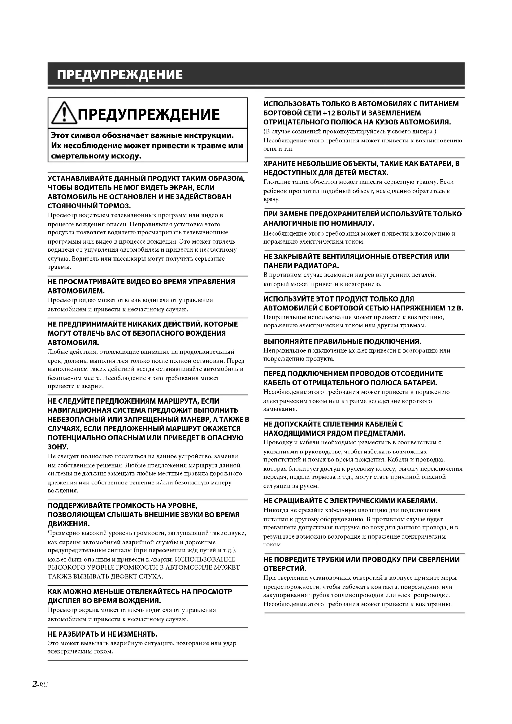 - Технические характеристики ALPINE X902D/X802D-U/INE-W710D/i902D/iLX-702D 68-34732Z07-A (RU) 2-RU ПРЕДУПРЕЖДЕНИЕ ПРЕДУПРЕЖДЕНИЕ Этот символ обозначает важные инструкции. Их несоблюдение может привести к травме или смертельному исходу. УСТАНАВЛИВАЙТЕ ДАННЫЙ ПРОДУКТ ТАКИМ ОБРАЗОМ, ЧТОБЫ ВОДИТЕЛЬ НЕ МОГ ВИДЕТЬ ЭКРАН, ЕСЛИ АВТОМОБИЛЬ НЕ ОСТАНОВЛЕН И НЕ ЗАДЕЙСТВОВАН СТОЯНОЧНЫЙ ТОРМОЗ.Просмотр водителем телевизионных программ или видео в процессе вождения опасен. Неправильная установка этого продукта позволяет водителю просматривать телевизионные программы или видео в процессе вождения. Это может отвлечь водителя от управления автомобилем и привести к несчастному случаю. Водитель или пассажиры могут получить серьезные травмы.НЕ ПРОСМАТРИВАЙТЕ ВИДЕО ВО ВРЕМЯ УПРАВЛЕНИЯ АВТОМОБИЛЕМ.Просмотр видео может отвлечь водителя от управления автомобилем и привести к несчастному случаю.НЕ ПРЕДПРИНИМАЙТЕ НИКАКИХ ДЕЙСТВИЙ, КОТОРЫЕ МОГУТ ОТВЛЕЧЬ ВАС ОТ БЕЗОПАСНОГО ВОЖДЕНИЯ АВТОМОБИЛЯ.Любые действия, отвлекающие внимание на продолжительный срок, должны выполняться только после полной остановки. Перед выполнением таких действий всегда останавливайте автомобиль в безопасном месте. Несоблюдение этого требования может привести к аварии.НЕ СЛЕДУЙТЕ ПРЕДЛОЖЕНИЯМ МАРШРУТА, ЕСЛИ НАВИГАЦИОННАЯ СИСТЕМА ПРЕДЛОЖИТ ВЫПОЛНИТЬ НЕБЕЗОПАСНЫЙ ИЛИ ЗАПРЕЩЕННЫЙ МАНЕВР, А ТАКЖЕ В СЛУЧАЯХ, ЕСЛИ ПРЕДЛОЖЕННЫЙ МАРШРУТ ОКАЖЕТСЯ ПОТЕНЦИАЛЬНО ОПАСНЫМ ИЛИ ПРИВЕДЕТ В ОПАСНУЮ ЗОНУ.Не следует полностью полагаться на данное устройство, заменяя им собственные решения. Любые предложения маршрута данной системы не должны замещать любые местные правила дорожного движения или собственное решение и/или безопасную манеру вождения.ПОДДЕРЖИВАЙТЕ ГРОМКОСТЬ НА УРОВНЕ, ПОЗВОЛЯЮЩЕМ СЛЫШАТЬ ВНЕШНИЕ ЗВУКИ ВО ВРЕМЯ ДВИЖЕНИЯ.Чрезмерно высокий уровень громкости, заглушающий такие звуки, как сирены автомобилей аварийной службы и дорожные предупредительные сигналы (при пересечении ж/д путей и т.д.), может быть опасным и привести к аварии. ИСПОЛЬЗОВАНИЕ ВЫСОКОГО УРОВНЯ ГРОМКОСТИ В АВТОМОБИЛЕ МОЖЕТ ТАКЖЕ ВЫЗЫВАТЬ ДЕФЕКТ СЛУХА.КАК МОЖНО МЕНЬШЕ ОТВЛЕКАЙТЕСЬ НА ПРОСМОТР ДИСПЛЕЯ ВО ВРЕМЯ ВОЖДЕНИЯ.Просмотр экрана может отвлечь водителя от управления автомобилем и привести к несчастному случаю.НЕ РАЗБИРАТЬ И НЕ ИЗМЕНЯТЬ.Это может вызывать аварийную ситуацию, возгорание или удар электрическим током.ИСПОЛЬЗОВАТЬ ТОЛЬКО В АВТОМОБИЛЯХ С ПИТАНИЕМ БОРТОВОЙ СЕТИ +12 ВОЛЬТ И ЗАЗЕМЛЕНИЕМ ОТРИЦАТЕЛЬНОГО ПОЛЮСА НА КУЗОВ АВТОМОБИЛЯ.(В случае сомнений проконсультируйтесь у своего дилера.) Несоблюдение этого требования может привести к возникновению огня и т.п.ХРАНИТЕ НЕБОЛЬШИЕ ОБЪЕКТЫ, ТАКИЕ КАК БАТАРЕИ, В НЕДОСТУПНЫХ ДЛЯ ДЕТЕЙ МЕСТАХ.Глотание таких объектов может нанести серьезную травму. Если ребенок проглотил подобный объект, немедленно обратитесь к врачу.ПРИ ЗАМЕНЕ ПРЕДОХРАНИТЕЛЕЙ ИСПОЛЬЗУЙТЕ ТОЛЬКО АНАЛОГИЧНЫЕ ПО НОМИНАЛУ.Несоблюдение этого требования может привести к возгоранию и поражению электрическим током.НЕ ЗАКРЫВАЙТЕ ВЕНТИЛЯЦИОННЫЕ ОТВЕРСТИЯ ИЛИ ПАНЕЛИ РАДИАТОРА.В противном случае возможен нагрев внутренних деталей, который может привести к возгоранию.ИСПОЛЬЗУЙТЕ ЭТОТ ПРОДУКТ ТОЛЬКО ДЛЯ АВТОМОБИЛЕЙ С БОРТОВОЙ СЕТЬЮ НАПРЯЖЕНИЕМ 12 В.Неправильное использование может привести к возгорани