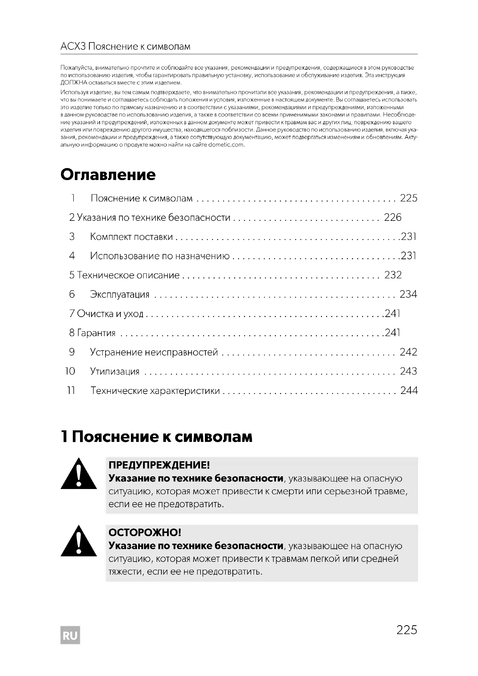 Указание по технике безопасности, указывающее на опасную ситуацию, которая может привести к травмам легкой или средней тяжести, если ее не предотвратить. DometicACX3_30-ACX3_40-ACX3_40G_OPM_4445103211_EMEA16_202x-xx-xx.book Seite 225 Donnerstag, 15. Juli 2021 5:12 17RU Указания по технике безопасности ACX3