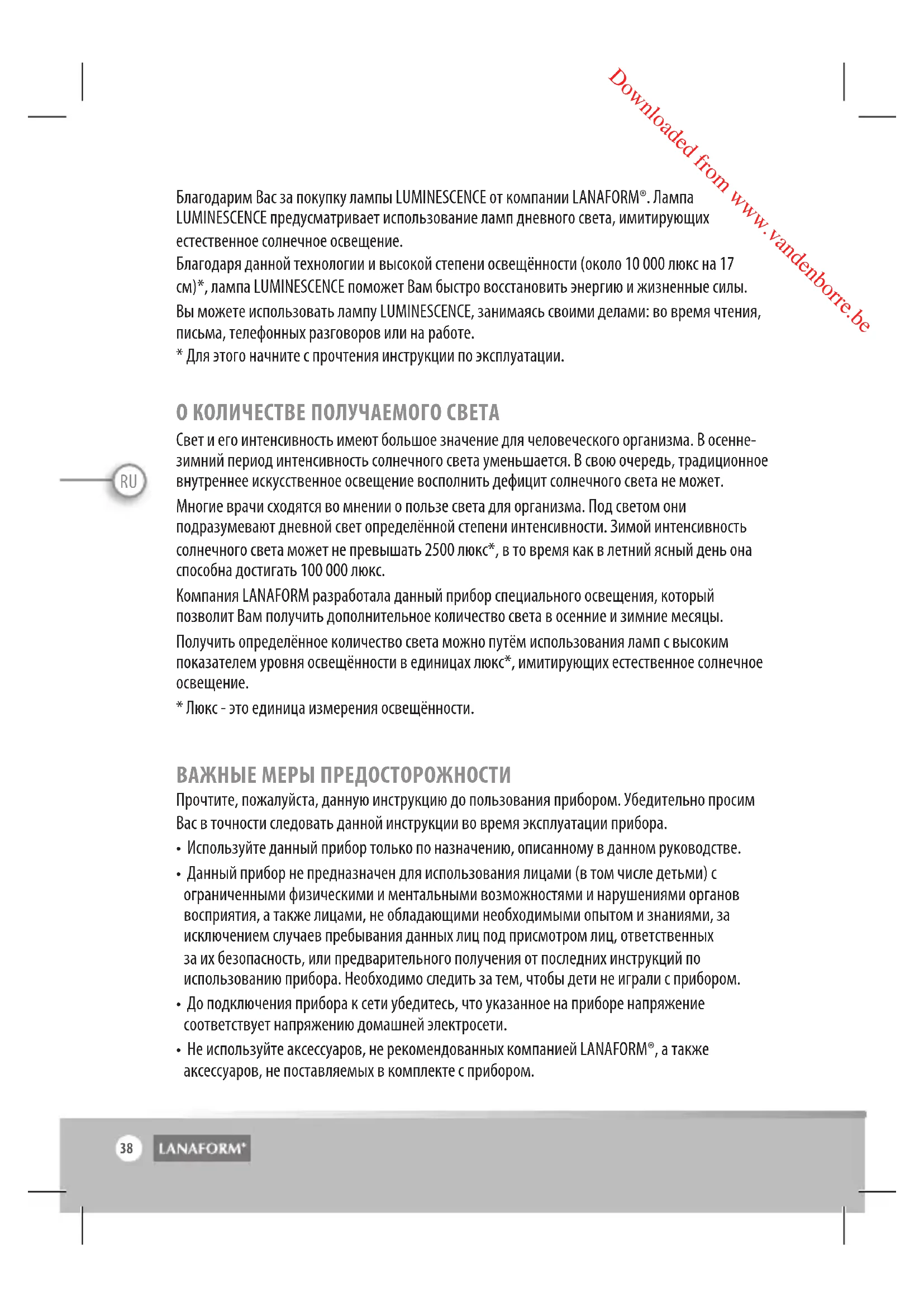 Downloaded from www.vandenborre.beRU Благодарим Вас за покупку лампы LUMINESCENCE от компании LANAFORM®. Лампа LUMINESCENCE предусматривает использование ламп дневного света, имитирующих естественное солнечное освещение. Благодаря данной технологии и высокой степени освещённости (около 10 000 люкс на 17 см)*, лампа LUMINESCENCE поможет Вам быстро восстановить энергию и жизненные силы. Вы можете использовать лампу LUMINESCENCE, занимаясь своими делами: во время чтения, письма, телефонных разговоров или на работе.