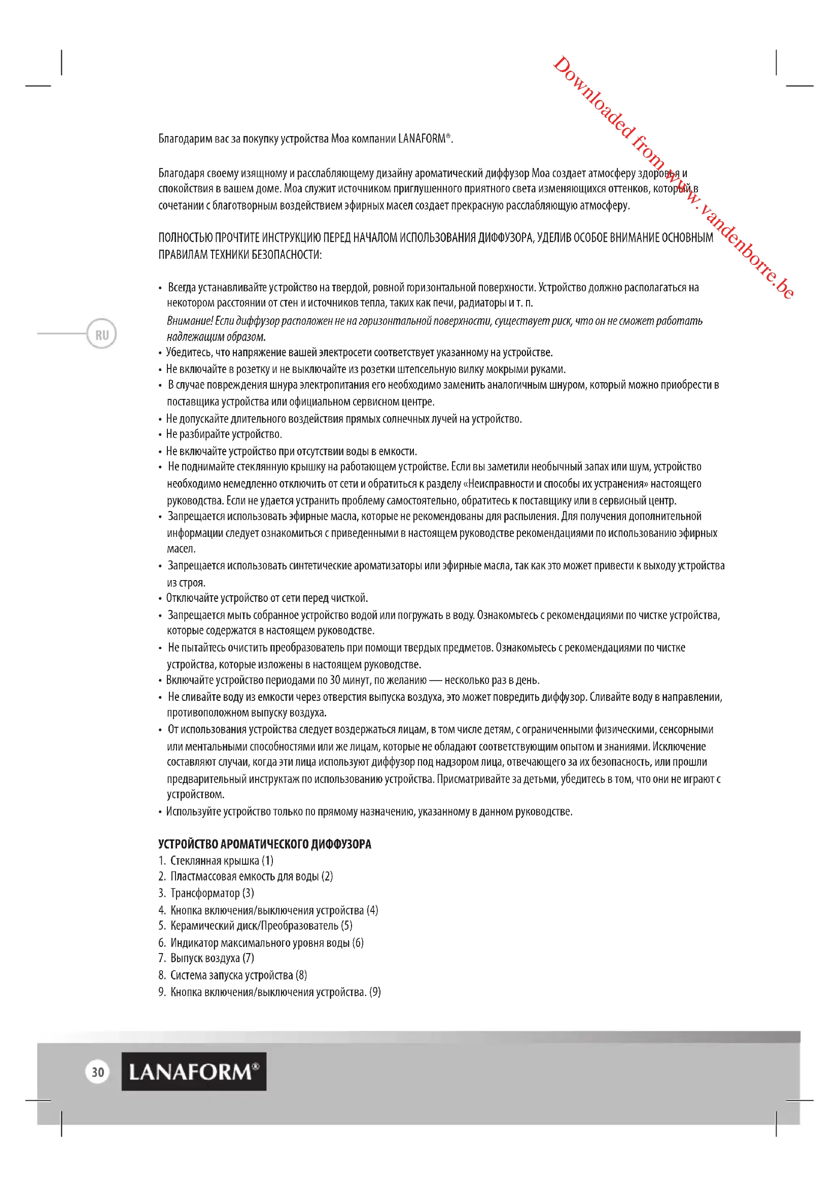 Downloaded from www.vandenborre.be30 Благодарим вас за покупку устройства Moa компании LANAFORМ®. Благодаря своему изящному и расслабляющему дизайну ароматический диффузор Moa создает атмосферу здоровья и спокойствия в вашем доме. Moa служит источником приглушенного приятного света изменяющихся оттенков, который в сочетании с благотворным воздействием эфирных масел создает прекрасную расслабляющую атмосферу. ПОЛНОСТЬЮ ПРОЧТИТЕ ИНСТРУКЦИЮ ПЕРЕД НАЧАЛОМ ИСПОЛЬЗОВАНИЯ ДИФФУЗОРА, УДЕЛИВ ОСОБОЕ ВНИМАНИЕ ОСНОВНЫМ ПРАВИЛАМ ТЕХНИКИ БЕЗОПАСНОСТИ: