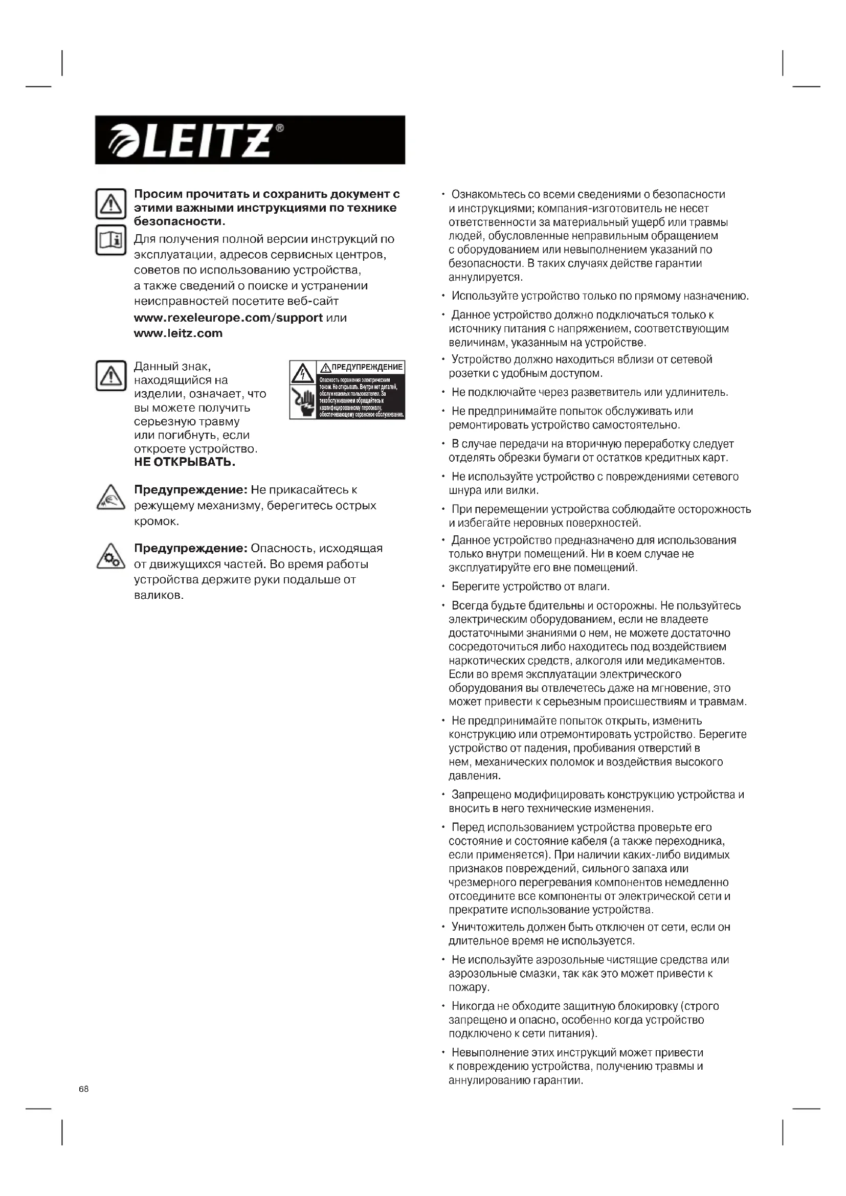 - Невыполнение этих инструкций может привести к повреждению устройства, получению травмы и аннулированию гарантии. Просим прочитать и сохранить документ с этими важными инструкциями по технике безопасности. Для получения полной версии инструкций по эксплуатации, адресов сервисных центров, советов по использованию устройства, а также сведений о поиске и устранении неисправностей посетите веб-сайт www.rexeleurope.com/support или www.leitz.com Предупреждение: Не прикасайтесь к режущему механизму, берегитесь острых