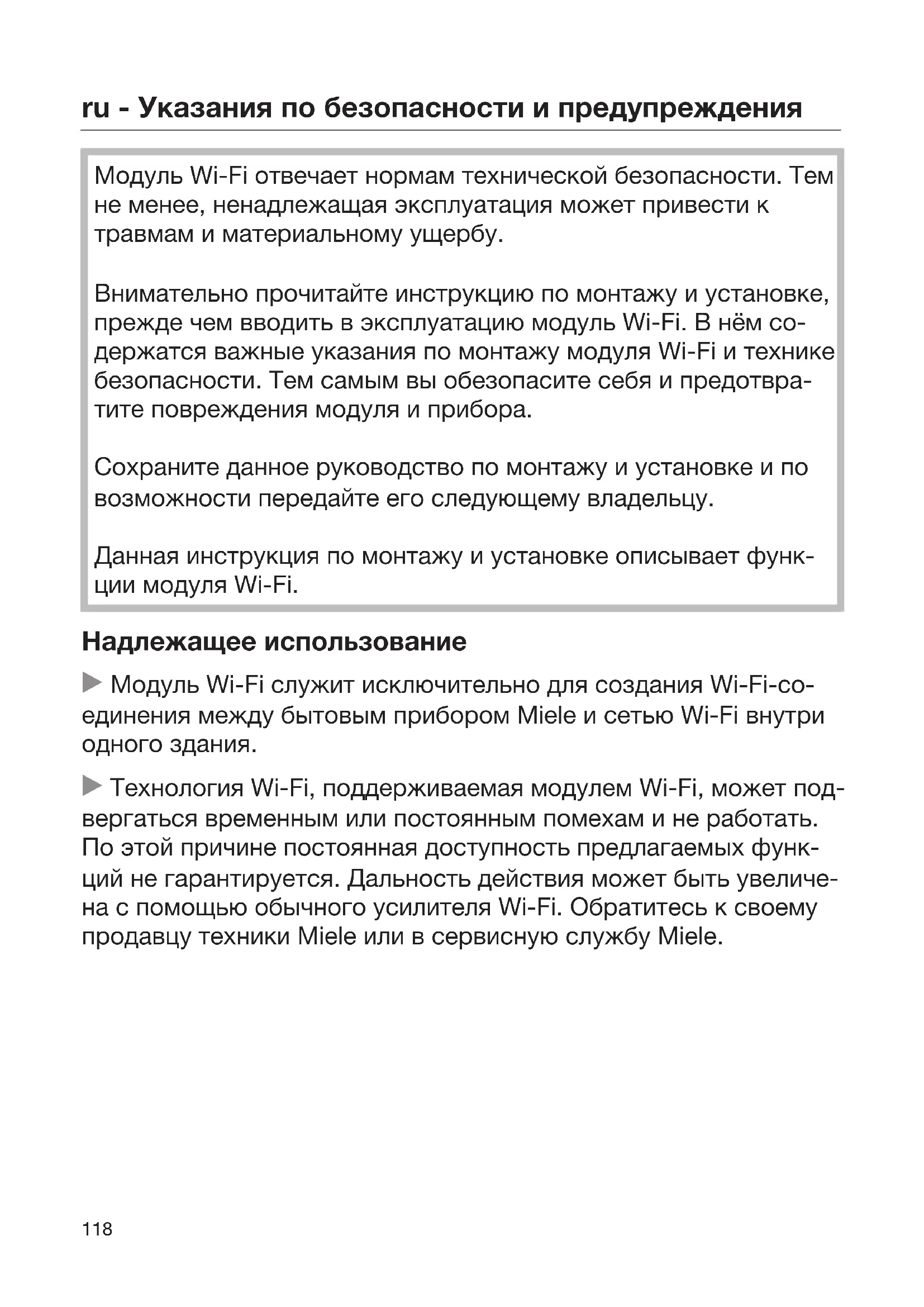 Модуль Wi-Fi отвечает нормам технической безопасности. Тем не менее, ненадлежащая эксплуатация может привести к травмам и материальному ущербу. Внимательно прочитайте инструкцию по монтажу и установке, прежде чем вводить в эксплуатацию модуль Wi-Fi. В нём со- держатся важные указания по монтажу модуля Wi-Fi и технике безопасности. Тем самым вы обезопасите себя и предотвра- тите повреждения модуля и прибора. Сохраните данное руководство по монтажу и установке и по возможности передайте его следующему владельцу. Данная инструкция по монтажу и установке описывает функ- ции модуля Wi-Fi. Надлежащее использование Модуль Wi-Fi служит исключительно для создания Wi-Fi-со- единения между бытовым прибором Miele и сетью Wi-Fi внутри одного здания. Технология Wi-Fi, поддерживаемая модулем Wi-Fi, может под- вергаться временным или постоянным помехам и не работать. По этой причине постоянная доступность предлагаемых функ- ций не гарантируется. Дальность действия может быть увеличе- на с помощью обычного усилителя Wi-Fi. Обратитесь к своему продавцу техники Miele или в сервисную службу Miele.ru - Указания по безопасности и предупреждения