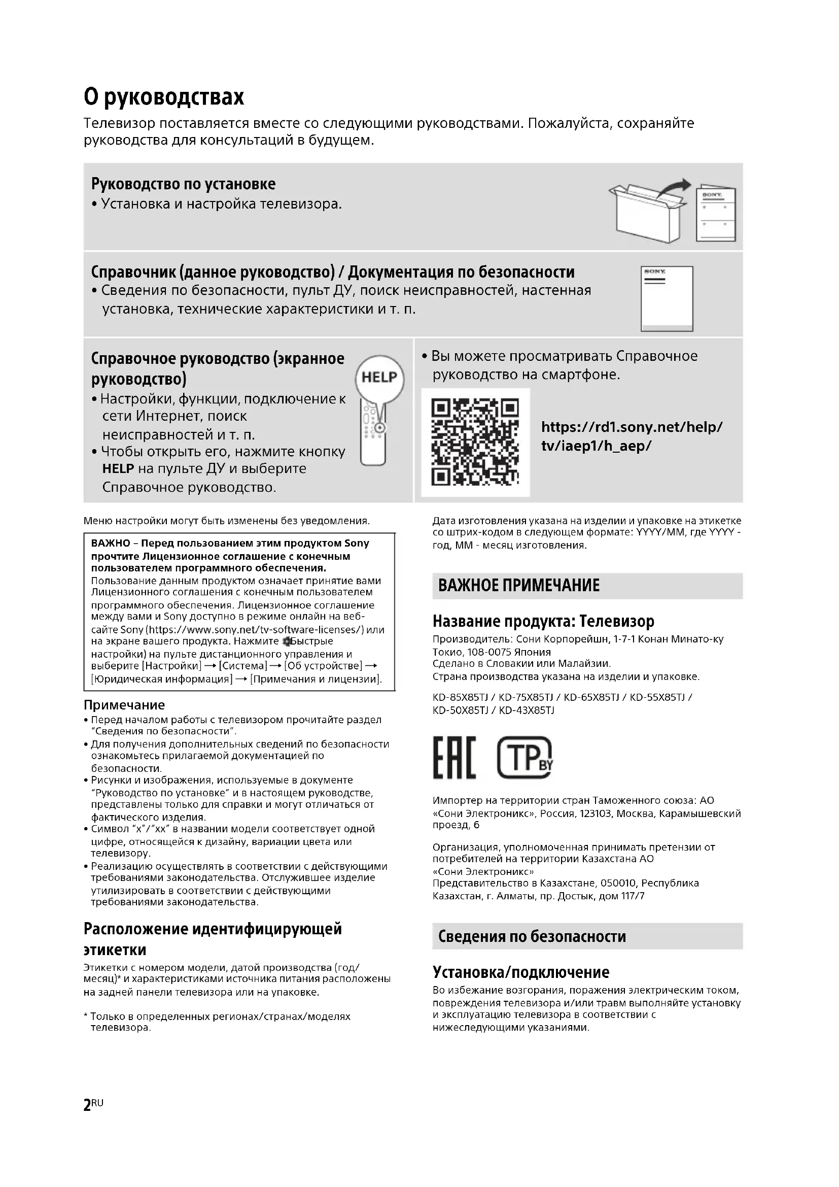 - Только в определенных регионах/странах/моделях телевизора. Дата изготовления указана на изделии и упаковке на этикетке со штрих-кодом в следующем формате: YYYY/MM, где YYYY - год, MM - месяц изготовления. Название продукта: Телевизор Производитель: Сони Корпорейшн, 1-7-1 Конан Минато-ку Токио, 108-0075 Япония Сделано в Словакии или Малайзии. Страна производства указана на изделии и упаковке. KD-85X85TJ / KD-75X85TJ / KD-65X85TJ / KD-55X85TJ / KD-50X85TJ / KD-43X85TJ Импортер на территории стран Таможенного союза: АО «Сони Электроникс», Россия, 123103, Москва, Карамышевский проезд, 6 Организация, уполномоченная принимать претензии от потребителей на территории Казахстана АО «Сони Электроникс» Представительство в Казахстане, 050010, Республика Казахстан, г. Алматы, пр. Достык, дом 117/7 Установка/подключение Во избежание возгорания, поражения электрическим током, повреждения телевизора и/или травм выполняйте установку и эксплуатацию телевизора в соответствии с нижеследующими указаниями. Руководство по установке