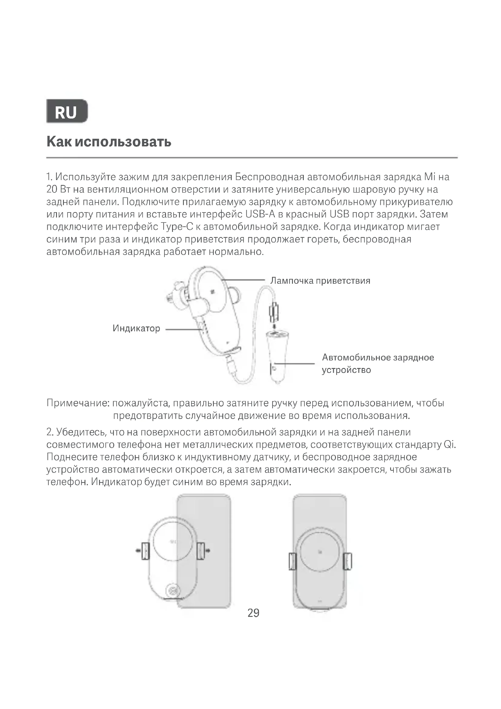 20 Вт на вентиляционном отверстии и затяните универсальную шаровую ручку на задней панели. Подключите прилагаемую зарядку к автомобильному прикуривателю или порту питания и вставьте интерфейс USВ-А в красный USВ порт зарядки. Затем подключите интерфейс Туре-С к автомобильной зарядке. Когда индикатор мигает синим три раза и индикатор приветствия продолжает гореть, беспроводная автомобильная зарядка работает нормально.* Когда телефон, не поддерживающий беспроводную зарядку, установлен на автомобильную зарядку, индикатор будет мигать.