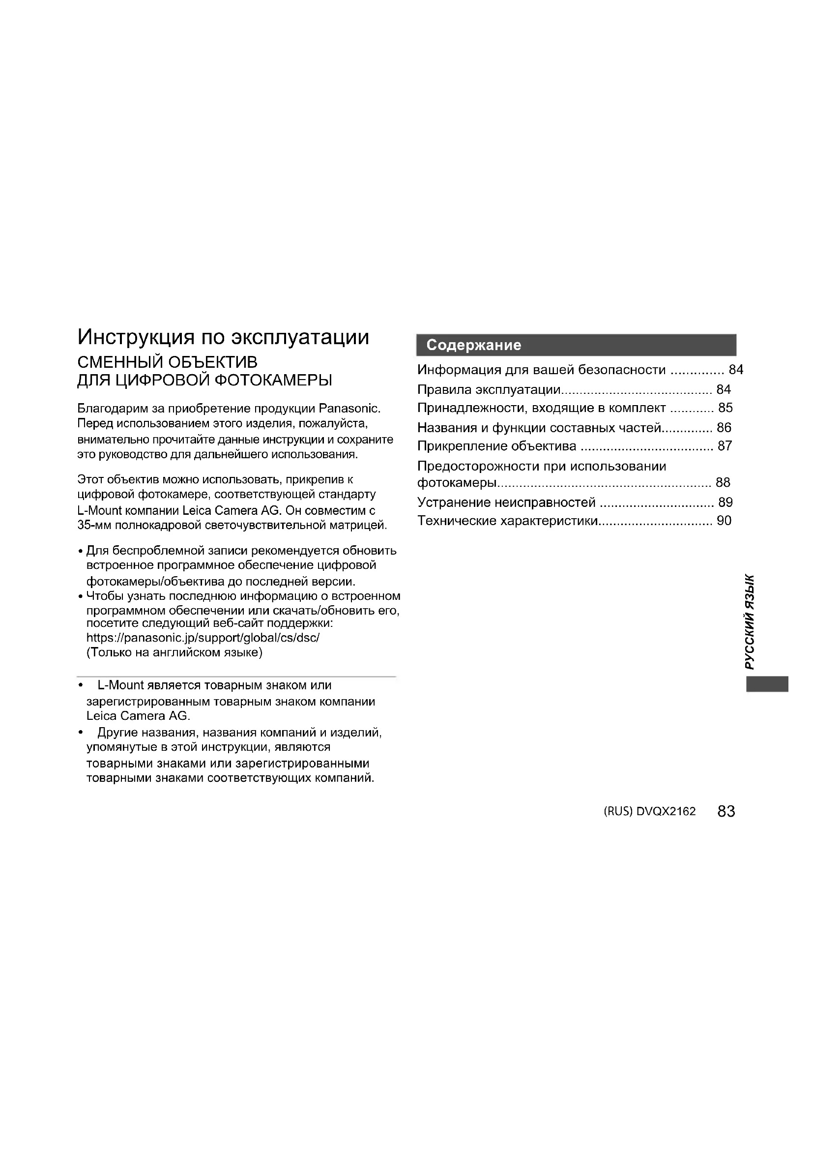 - ḷ߶ԓQ/XMSX 153 S-R70300-DVQX2162.book 82 ページ 2021年2月17日 水曜日 午後6時32分83 (RUS) DVQX2162 РУССКИЙ ЯЗЫК Инструкция по эксплуатации СМЕННЫЙ ОБЪЕКТИВ ДЛЯ ЦИФРОВОЙ ФОТОКАМЕРЫ Благодарим за приобретение продукции Panasonic.Перед использованием этого изделия, пожалуйста, внимательно прочитайте данные инструкции и сохраните это руководство для дальнейшего использования.Этот объектив можно использовать, прикрепив к цифровой фотокамере, соответствующей стандарту L-Mount компании Leica Camera AG. Он совместим с 35-мм полнокадровой светочувствительной матрицей. Для беспроблемной записи рекомендуется обновить встроенное программное обеспечение цифровой фотокамеры/объектива до последней версии. Чтобы узнать последнюю информацию о встроенном программном обеспечении или скачать/обновить его, посетите следующий веб-сайт поддержки:https://panasonic.jp/support/global/cs/dsc/(Только на английском языке) 0 L-Mount является товарным знаком или зарегистрированным товарным знаком компании Leica Camera AG. 0 Другие названия, названия компаний и изделий, упомянутые в этой инструкции, являются товарными знаками или зарегистрированными товарными знаками соответствующих компаний. Информация для вашей безопасности p. 84