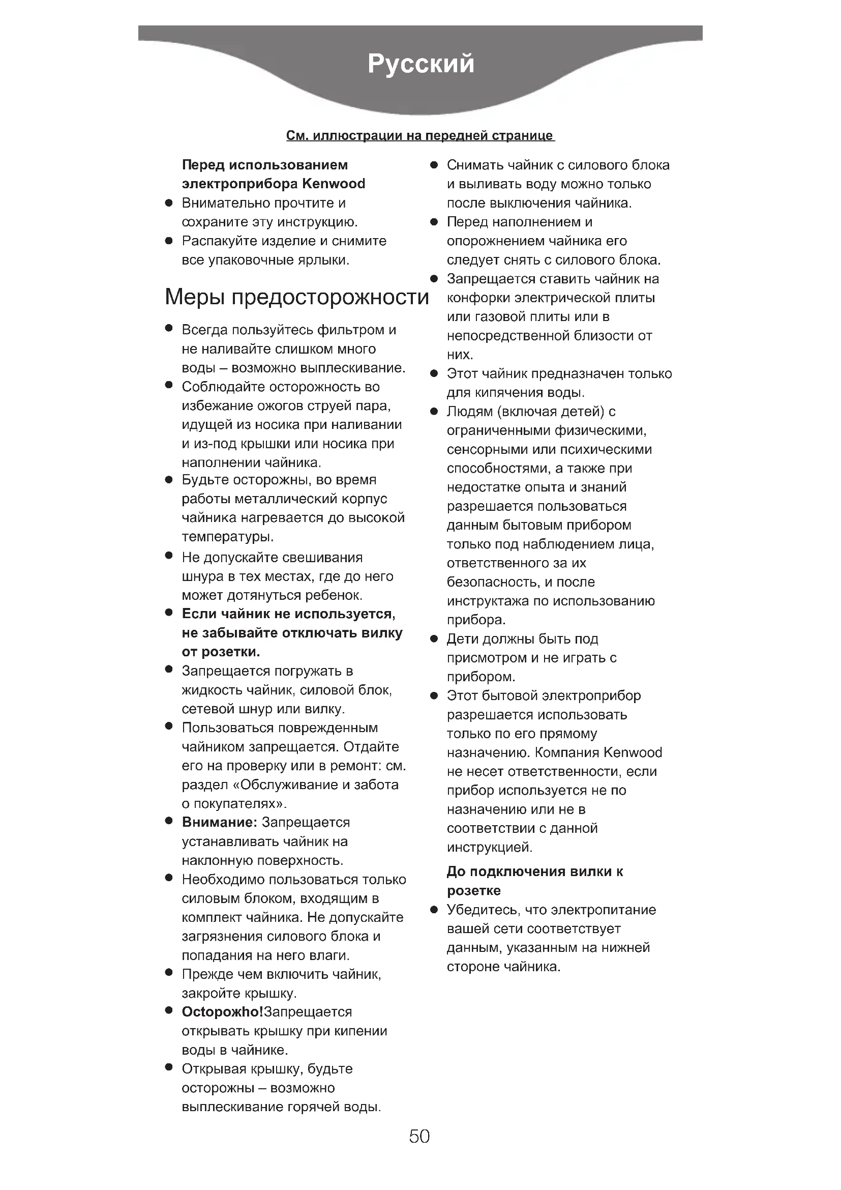 Этот бытовой электроприбор разрешается использовать только по его прямому назначению. Компания Kenwood не несет ответственности, если прибор используется не по назначению или не в соответствии с данной инструкцией. До подключения вилки к