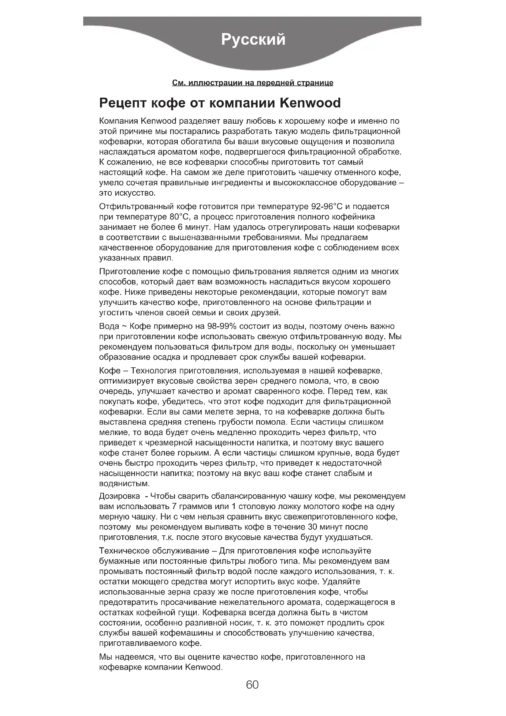 DYREKTYWĄ EUROPEJSKĄ 2002/96/EC. W momencie zakończenia okresu użyteczności produktu nie należy wyrzucać go do odpadów miejskich. Można dostarczyć go do odpowiednich ośrodków segregujących odpady przygotowanych przez władze miejskie lub do jednostek zapewniających takie usługi. Osobne usuwanie sprzętu AGD pozwala uniknąć negatywnych skutków dla środowiska naturalnego i zdrowia wynikających z jego nieodpowiedniego usuwania i umożliwia odzyskiwanie materiałów, z których jest złożony, oraz osiągnięcia w ten sposób znaczącej oszczędności energii i zasobów. Na obowiązek osobnego usuwania sprzętu AGD wskazuje umieszczony na produkcie symbol przekreślonego pojemnika na śmieci. 59Рецепт кофе от компании Kenwood Компания Kenwood разделяет вашу любовь к хорошему кофе и именно по этой причине мы постарались разработать такую модель фильтрационной кофеварки, которая обогатила бы ваши вкусовые ощущения и позволила наслаждаться ароматом кофе, подвергшегося фильтрационной обработке. К сожалению, не все кофеварки способны приготовить тот самый настоящий кофе. На самом же деле приготовить чашечку отменного кофе, умело сочетая правильные ингредиенты и высококлассное оборудование – это искусство. Отфильтрованный кофе готовится при температуре 92-96°С и подается при температуре 80°С, а процесс приготовления полного кофейника занимает не более 6 минут. Нам удалось отрегулировать наши кофеварки в соответствии с вышеназванными требованиями. Мы предлагаем качественное оборудование для приготовления кофе с соблюдением всех указанных правил. Приготовление кофе с помощью фильтрования является одним из многих способов, который дает вам возможность насладиться вкусом хорошего кофе. Ниже приведены некоторые рекомендации, которые помогут вам улучшить качество кофе, приготовленного на основе фильтрации и угостить членов своей семьи и своих друзей. Вода ~ Кофе примерно на 98-99% состоит из воды, поэтому очень важно при приготовлении кофе использовать свежую отфильтрованную воду. Мы рекомендуем пользоваться фильтром для воды, поскольку он уменьшает образование осадка и продлевает срок службы вашей кофеварки. Кофе – Технология приготовления, используемая в нашей кофеварке, оптимизирует вкусовые свойства зерен среднего помола, что, в свою очередь, улучшает качество и аромат сваренного кофе. Перед тем, как покупать кофе, убедитесь, что этот кофе подходит для фильтрационной кофеварки. Если вы сами мелете зерна, то на кофеварке должна быть выставлена средняя степень грубости помола. Если частицы слишком мелкие, то вода будет очень медленно проходить через фильтр, что приведет к чрезмерной насыщенности напитка, и поэтому вкус вашего кофе станет более горьким. А если частицы слишком крупные, вода будет очень быстро проходить через фильтр, что приведет к недостаточной насыщенности напитка; поэтому на вкус ваш кофе станет слабым и водянистым. Дозировка - Чтобы сварить сбалансированную чашку кофе, мы рекомендуем вам использовать 7 граммов или 1 столовую ложку молотого кофе на одну мерную чашку. Ни с чем нельзя сравнить вкус свежеприготовленного кофе, поэтому мы рекомендуем выпивать кофе в течение 30 минут после приготовления, т.к. после этого вкусовые качества будут ухудшаться. Техническое обслуживание – Для приготовления кофе используйте бумажные или постоянные фильтры любого типа. Мы рекомендуем вам промывать постоянный фильтр водой после каждого использования, т. к. остатки моющего средства могут испортить вкус кофе. Удаляйте использованные зерна сразу же после приготовления кофе, чтобы предотвратить просачивание нежелательного ар