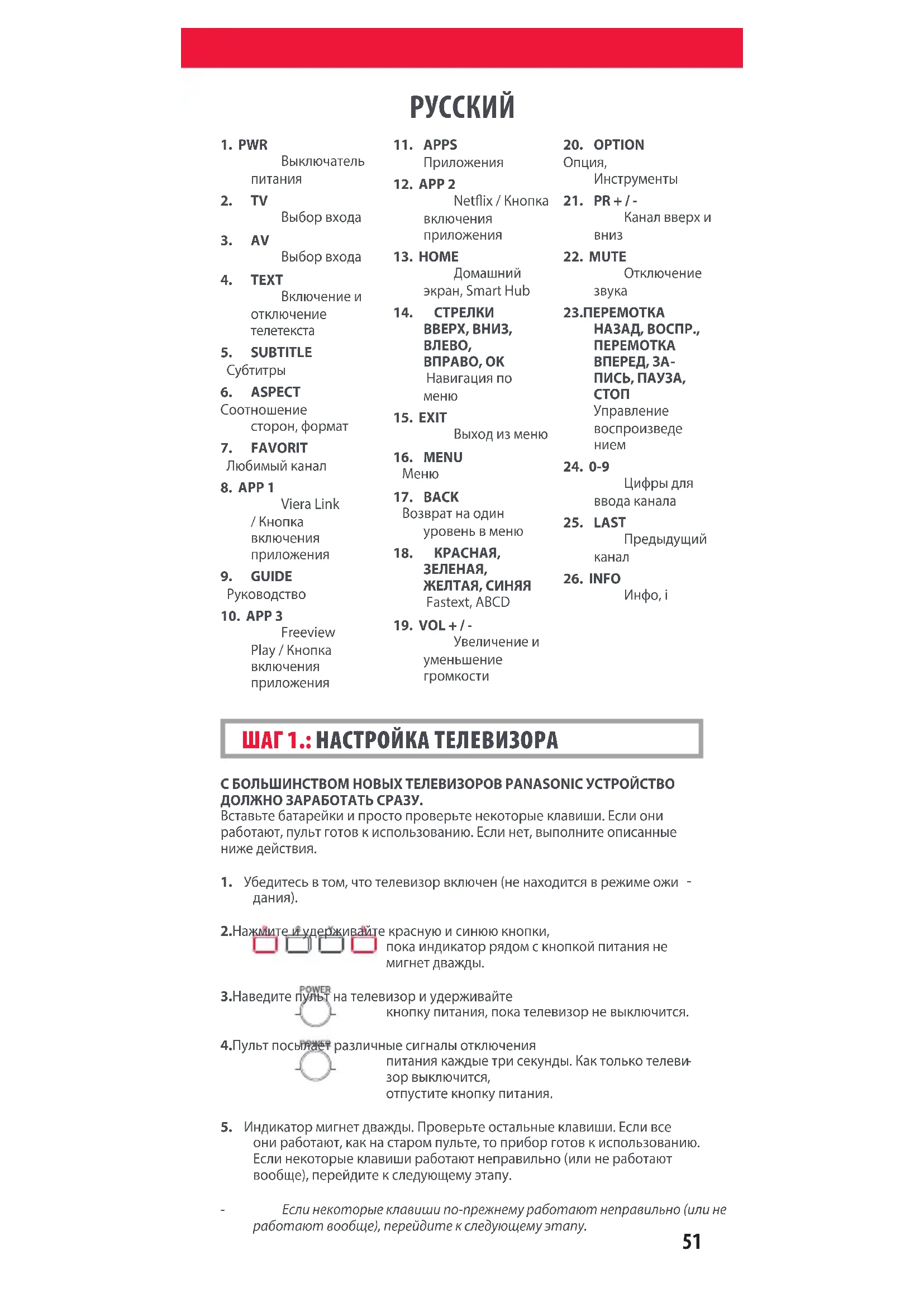 Инфо, i 712188_Panasonic_manual URC4914_RDN1091120.indd 51712188_Panasonic_manual URC4914_RDN1091120.indd 51 09-11-2020 13:1509-11-2020 13:1552 НАСТРОЙКА НОВЫХ ФУНКЦИЙ НА ПУЛЬТЕOne For All может выполнять функции других пультов ДУ. Положите старый пульт на ровную поверхность лицевой стороной к One For All.2. Настройка функций. Нажмите и удерживайте ЗЕЛЕНУЮ и ЖЕЛТУЮ клавиши, пока индикатор не мигнет дважды.3. Нажмите 975. Индикатор мигнет дважды.4. Нажмите клавишу на пульте One For All, для которой нужно настроить новые функции, например, VOL + (Громк. +). Индикатор кратковременно мигнет.5. Нажмите клавишу на старом пульте, функцию которой нужно настроить на новом, например VOL+ (Громк. +) на пульте аудиоустройства.6. Двойное мигание: процедура выполнена. Повторите, начи ная с шага 4, для следующей настраиваемой кнопки. Долгое мигание: повторите описанные действия, начиная с шага 4.7. Настроив все нужные функции, нажмите кнопку ОК и удер-живайте ее в течение 3 секунд. Индикатор мигнет дважды.УДАЛЕНИЕ НАСТРОЕННЫХ ФУНКЦИЙ 1. Нажмите и удерживайте ЗЕЛЕНУЮ и ЖЕЛТУЮ кнопки, пока индикатор не мигнет дважды.2. Нажмите 976.3. Дважды нажмите клавишу, функцию которой нужно сбросить. Индикатор мигнет дважды, и клавише будет назначена исходная функция. НАСТРОЙКА ФУНКЦИЙ НЕКОТОРЫЕ КЛАВИШИ РАБОТАЮТ НЕПРАВИЛЬНО?Если некоторые клавиши работают неправильно (или не работают вообще), перейдите к следующему этапу.1. Убедитесь в том, что телевизор включен (не находится в режиме ожидания).2. Нажмите и удерживайте КРАСНУЮ и СИНЮЮ кла-виши, пока индикатор рядом с кнопкой питания не мигнет дважды.3. Наведите пульт на телевизор и удерживайте одну из неправильно работающих клавиш, например MENU (Меню). 4. Пульт посылает сигнал каждые три секунды.5. После того как нужная функция (в данном случае MENU (Меню) отобразится на экране, отпустите клавишу.6. Когда индикатор мигнет дважды, пульт будет готов к работе. ШАГ 2.: ЧТО ДЕЛАТЬ, ЕСЛИ УСТРОЙСТВО НЕВЕРНО НАСТРОИЛОСЬ НА ЭТАПЕ 1?