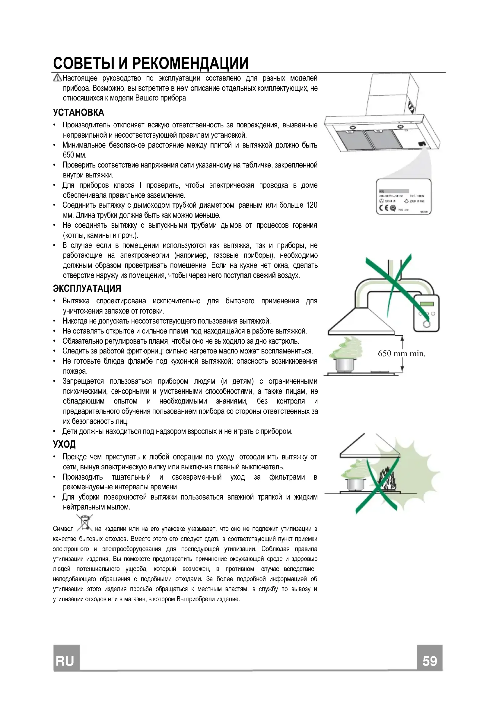 - Для уборки поверхностей вытяжки пользоваться влажной тряпкой и жидким нейтральным мылом. Символ на изделии или на его упаковке указывает, что оно не подлежит утилизации в качестве бытовых отходов. Вместо этого его следует сдать в соответствующий пункт приемки электронного и электрооборудования для последующей утилизации. Соблюдая правила утилизации изделия, Вы поможете предотвратить причинение окружающей среде и здоровью людей потенциального ущерба, который возможен, в противном случае, вследствие неподобающего обращения с подобными отходами. За более подробной информацией об утилизации этого изделия просьба обращаться к местным властям, в службу по вывозу и утилизации отходов или в магазин, в котором Вы приобрели изделие. 650 mm min.RU