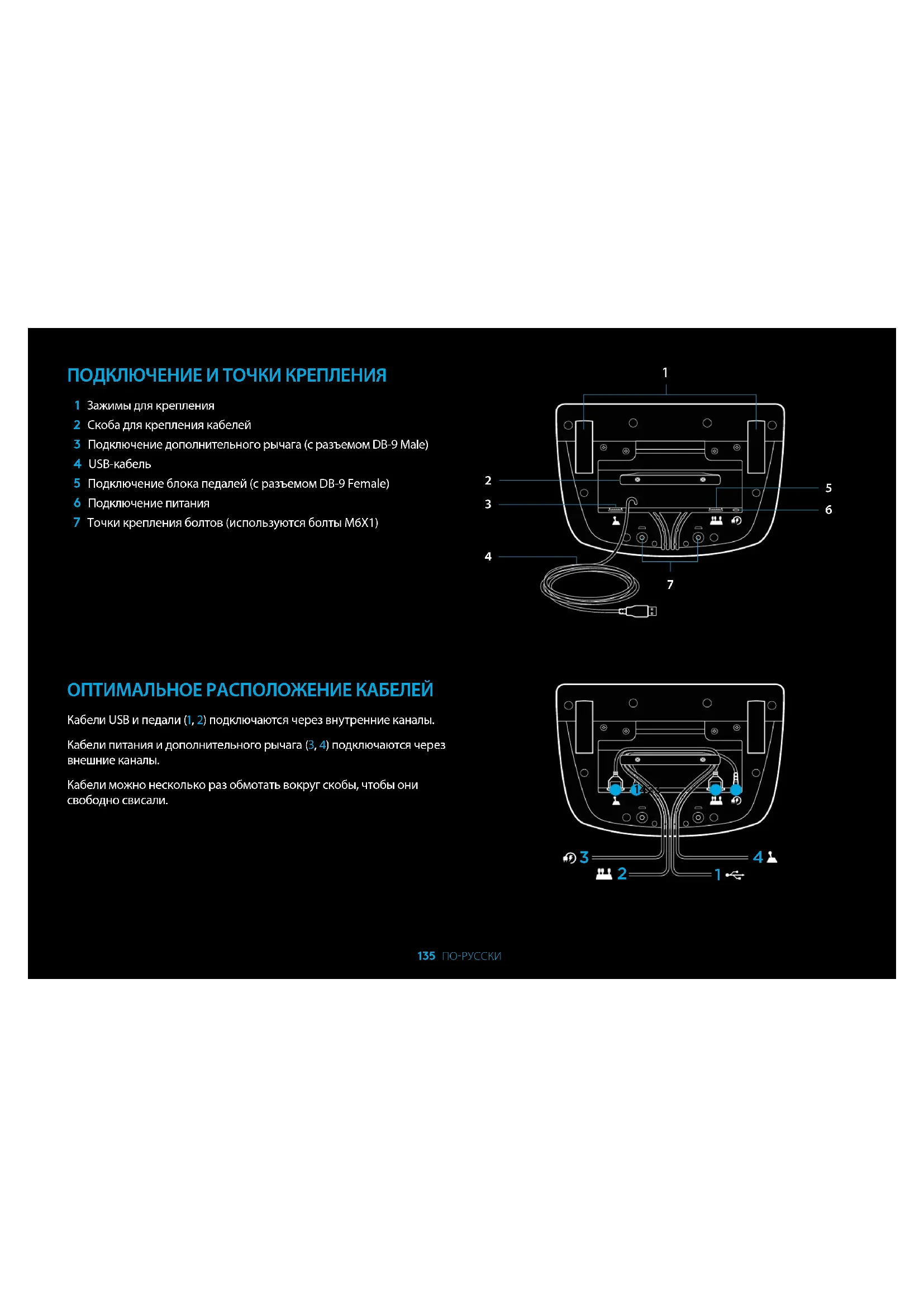 Подключите адаптер питания и USB-кабели, как показано на рисунке. При подключении спортивный руль в порядке калибровки полностью поворачивается в обе стороны, а затем возвращается в центральное положение. По окончании калибровки руль будет готов к работе. Чтобы включить светодиодный тахометр и функцию обратной связи по усилию при использовании руля G923 и блока педалей с ПК, необходимо установить ПОLogitechGHUB. Его можно загрузить настранице logitechg.com/support/g923-xb1137 ПО-РУССКИ ЗАЖИМЫ ДЛЯ КРЕПЛЕНИЯ Спортивный руль G923 оснащен встроенной системой зажимов, которые позволяют закрепить его на столе. Нажмите на зажимы и поверните их, чтобы зафиксировать руль,