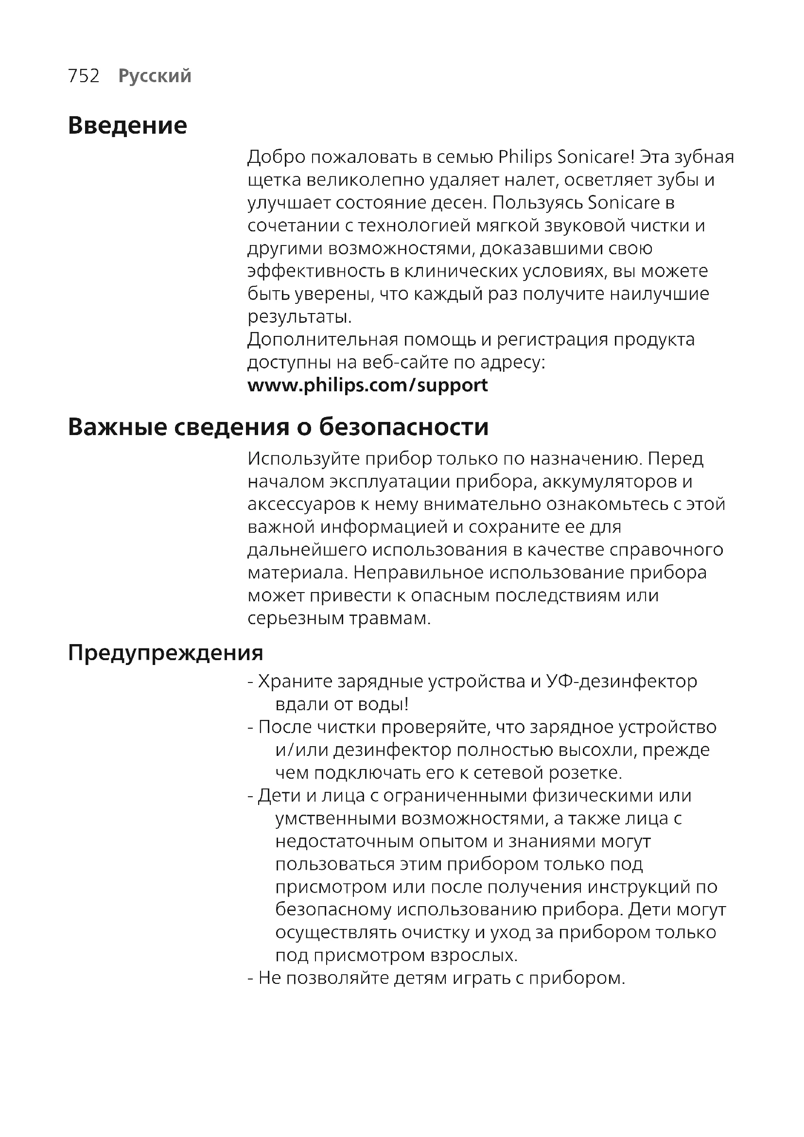 Добро пожаловать в семью Philips Sonicare! Эта зубная щетка великолепно удаляет налет, осветляет зубы и улучшает состояние десен. Пользуясь Sonicare в сочетании с технологией мягкой звуковой чистки и другими возможностями, доказавшими свою эффективность в клинических условиях, вы можете быть уверены, что каждый раз получите наилучшие результаты. Дополнительная помощь и регистрация продукта доступны на веб-сайте по адресу: www.philips.com/support Важные сведения о безопасности Используйте прибор только по назначению. Перед началом эксплуатации прибора, аккумуляторов и аксессуаров к нему внимательно ознакомьтесь с этой важной информацией и сохраните ее для дальнейшего использования в качестве справочного материала. Неправильное использование прибора может привести к опасным последствиям или серьезным травмам. Предупреждения - Храните зарядные устройства и УФ-дезинфектор вдали от воды! - После чистки проверяйте, что зарядное устройство и/или дезинфектор полностью высохли, прежде чем подключать его к сетевой розетке. - Дети и лица с ограниченными физическими или умственными возможностями, а также лица с недостаточным опытом и знаниями могут пользоваться этим прибором только под присмотром или после получения инструкций по безопасному использованию прибора. Дети могут осуществлять очистку и уход за прибором только под присмотром взрослых. - Не позволяйте детям играть с прибором.753
