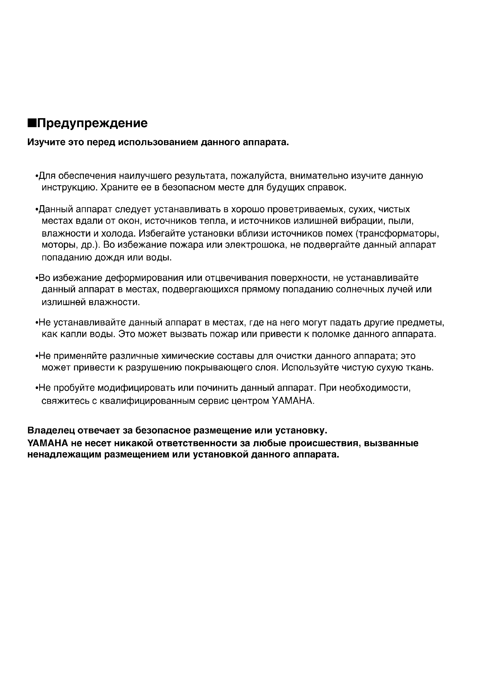 - Не пробуйте модифицировать или починить данный аппарат. При необходимости, свяжитесь с квалифицированным сервис центром YAMAHA. Владелец отвечает за безопасное размещение или установку. YA MAHA не несет никакой ответственности за любые происшествия, вызванные ненадлежащим размещением или установкой данного аппарата. ■ Предупреждение 08RU_01cau_YDS-10.p65 2/9/06, 5:36 PM21 ■ Проверка содержания упаковки Убедитесь в наличии в упаковке следующих деталей. (iPod не включен.) YDS-10 (Oсновной аппарат) Кабель дока (2 m) Доковые адаптеры iPod ( , , )