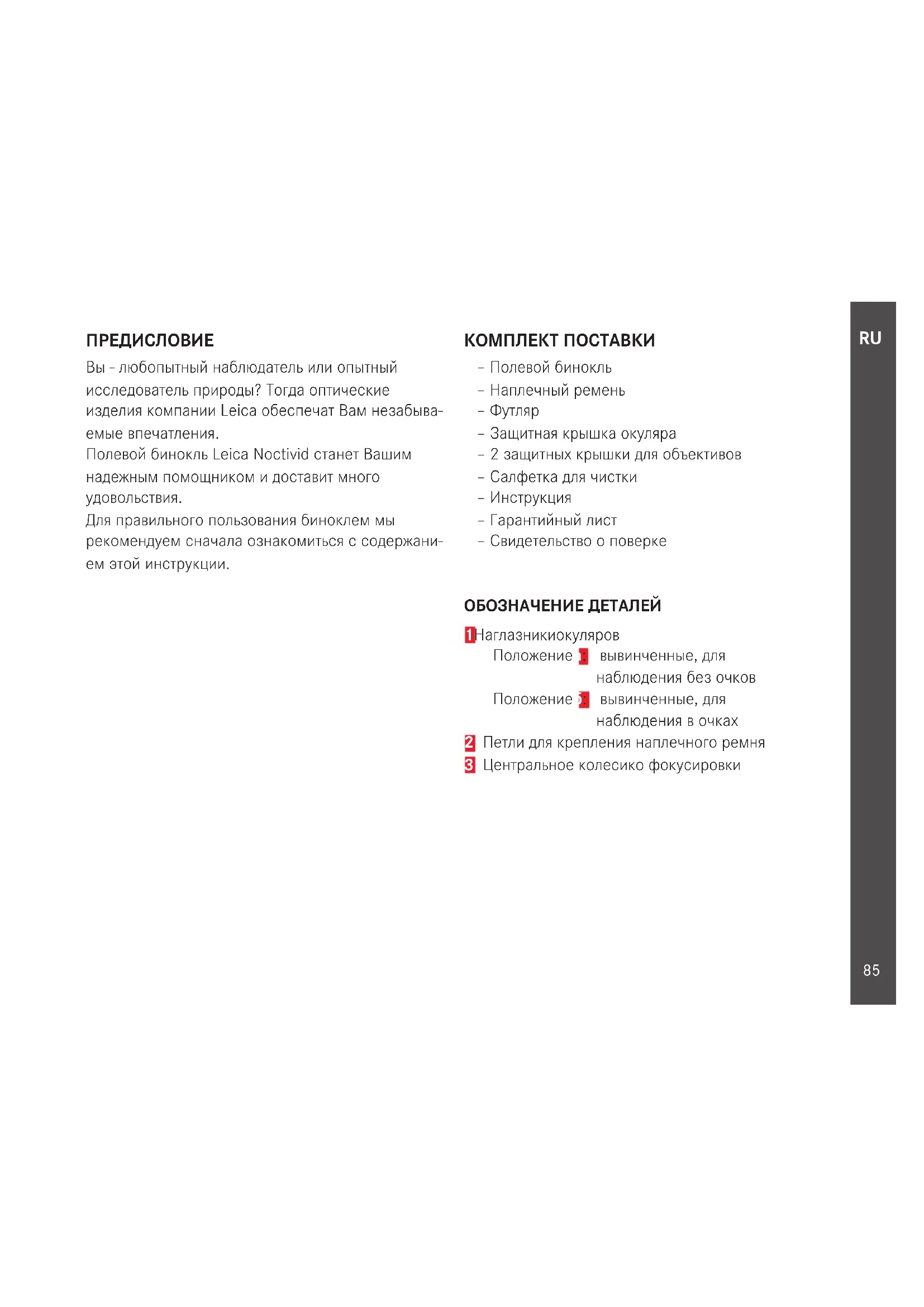 ПРЕДИСЛОВИЕ Вы - любопытный наблюдатель или опытный исследователь природы? Тогда оптические изделия компании Leica обеспечат Вам незабыва- емые впечатления. Полевой бинокль Leica Noctivid станет Вашим надежным помощником и доставит много удовольствия. Для правильного пользования биноклем мы рекомендуем сначала ознакомиться с содержани- ем этой инструкции. КОМПЛЕКТ ПОСТАВКИ – Полевой бинокль – Наплечный ремень