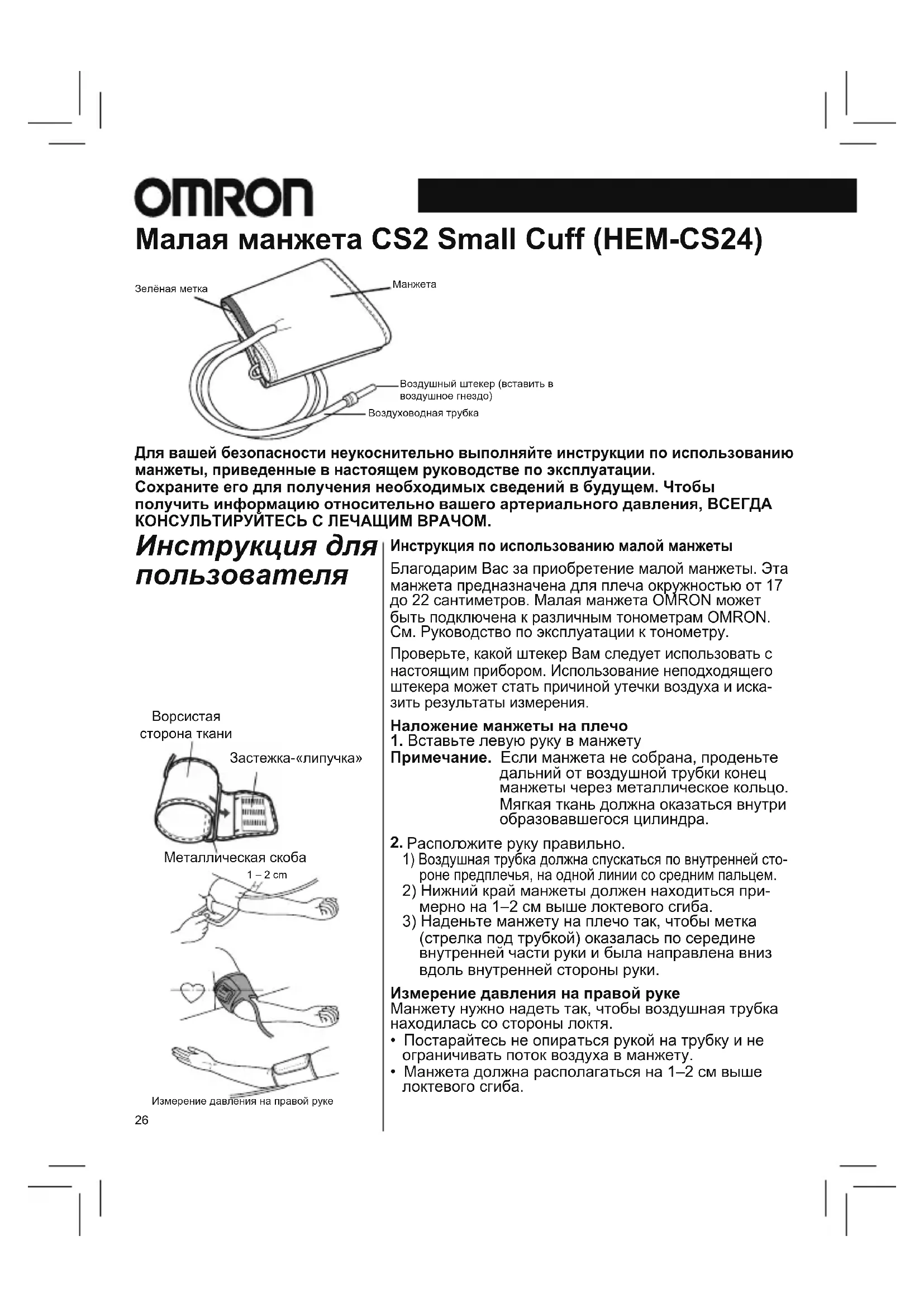 а должна располагаться на 1–2 см выше локтевого сгиба. Для вашей безопасности неукоснительно выполняйте инструкции по использованию манжеты, приведенные в настоящем руководстве по эксплуатации. Сохраните его для получения необходимых сведений в будущем. Чтобы получить информацию относительно вашего артериального давления, ВСЕГДА КОНСУЛЬТИРУЙТЕСЬ С ЛЕЧАЩИМ ВРАЧОМ. Малая манжета CS2 Small Cuff (HEM-CS24) Инструкция для пользователя РЕКОМЕНДАЦИИ УХОД И ХРАНЕНИЕ Зелёная меткаМанжетаВоздушный штекер (вставить в воздушное гнездо)Воздуховодная трубкаИзмерение давления на правой руке Pile side material Sewn hook material D-ring 1 – 2 cm Ворсистая сторона тканиЗастежка-«липучка»Металлическая скоба1 – 2 cmRU