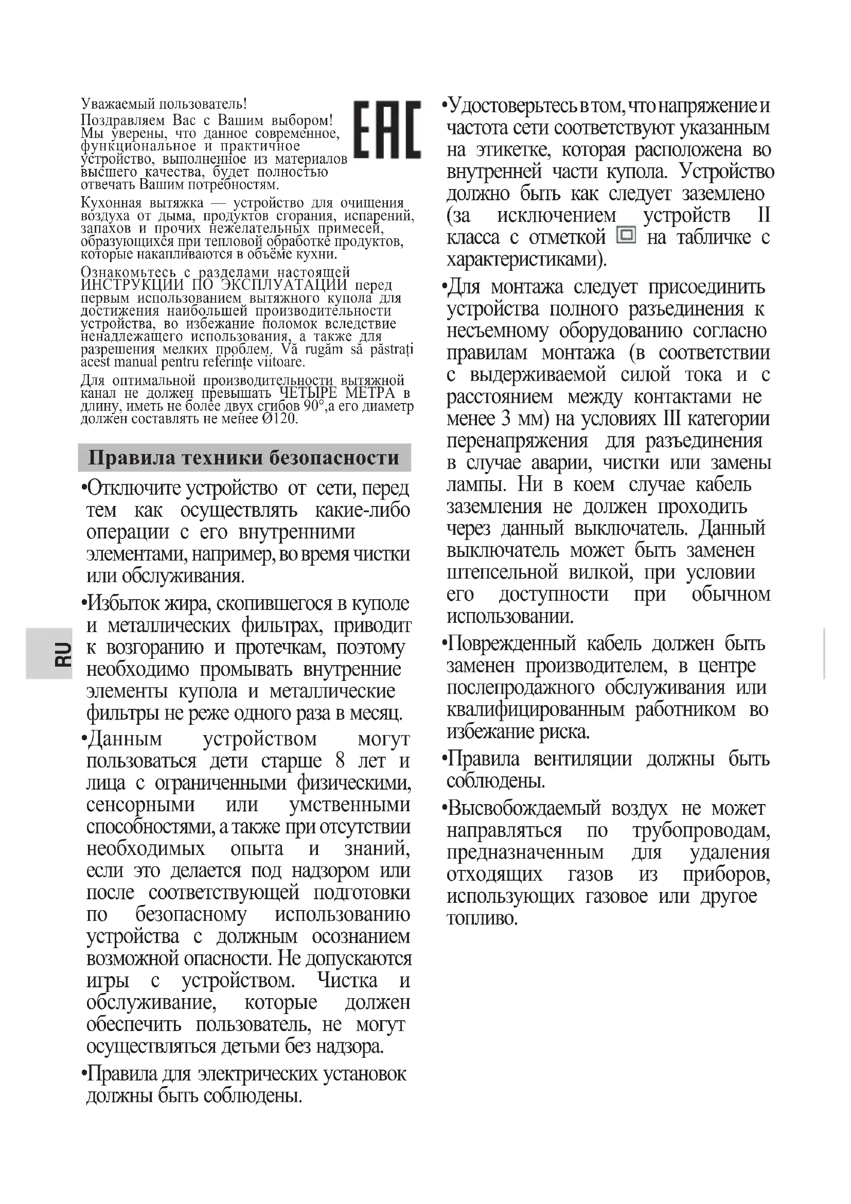 Уважаемый пользователь! Поздравляем Вас с Вашим выбором! Мы уверены, что данное современное, функциональное и практичное устройство, выполненное из материалов высшего качества, будет полностью отвечать Вашим потребностям. Кухонная вытяжка — устройство для очищения воздуха от дыма, продуктов сгорания, испарений, запахов и прочих нежелательных примесей, образующихся при тепловой обработке продуктов, которые накапливаются в объёме кухни. Ознакомьтесь с разделами настоящей ИНСТРУКЦИИ ПО ЭКСПЛУАТАЦИИ перед первым использованием вытяжного купола для достижения наибольшей производительности устройства, во избежание поломок вследствие ненадлежащего использования, а также для разрешения мелких проблем. Vă rugăm să păstrați acest manual pentru referințe viitoare. Для оптимальной производительности вытяжной канал не должен превышать ЧЕТЫРЕ МЕТРА в длину, иметь не более двух сгибов 90°,а его диаметр должен составлять не менее Ø120.