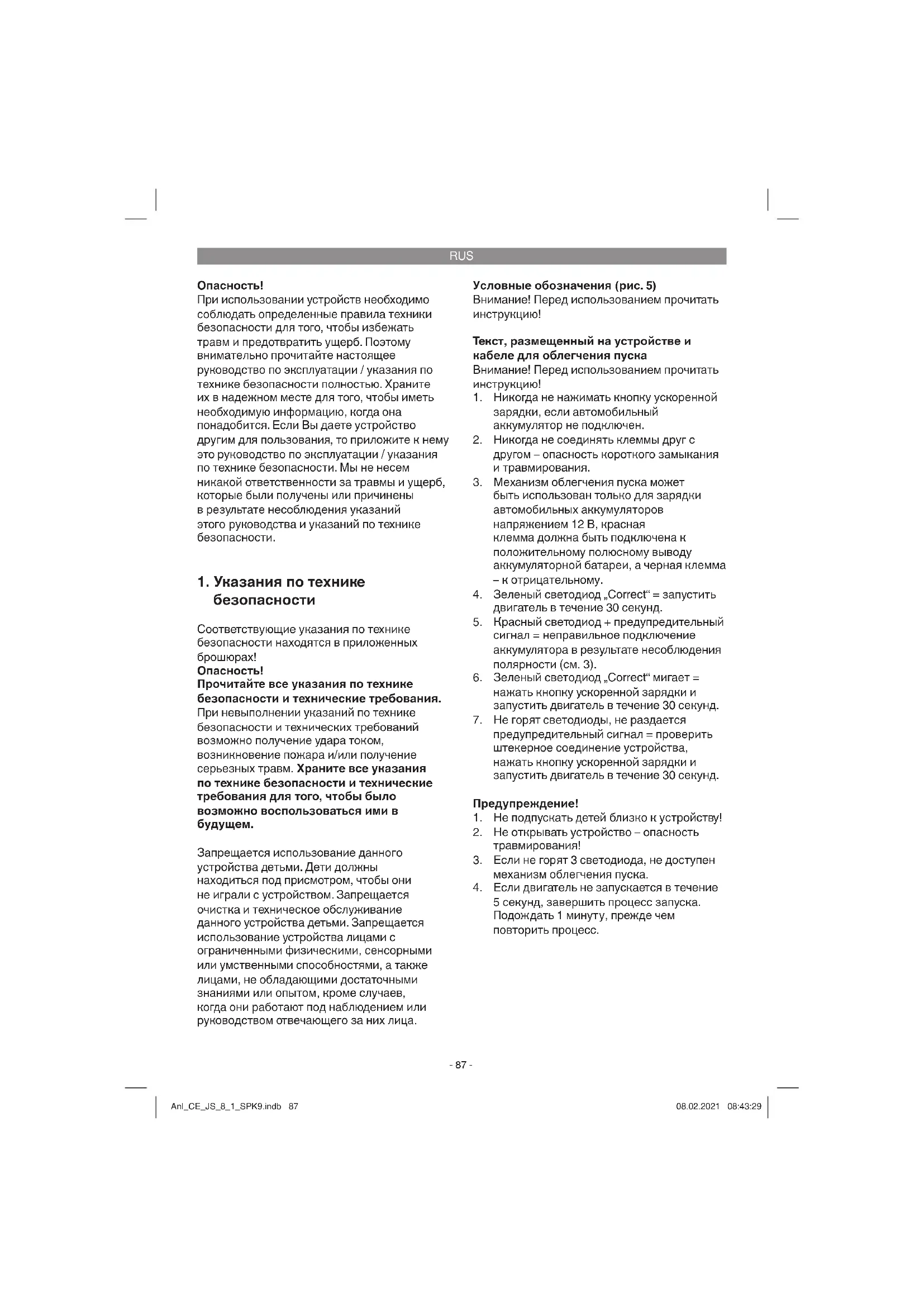 заряжает встроенный автомобильный аккумулятор. При очень низких температурах может потребоваться несколько попыток для запуска двигателя автомобиля. Время между попытками запуска должно составлять одну минуту. После успешного запуска отключите устройство по возможности в течение 30 Anl_CE_JS_8_1_SPK9.indb 91Anl_CE_JS_8_1_SPK9.indb 91 08.02.2021 08:43:3008.02.2021 08:43:30RUS