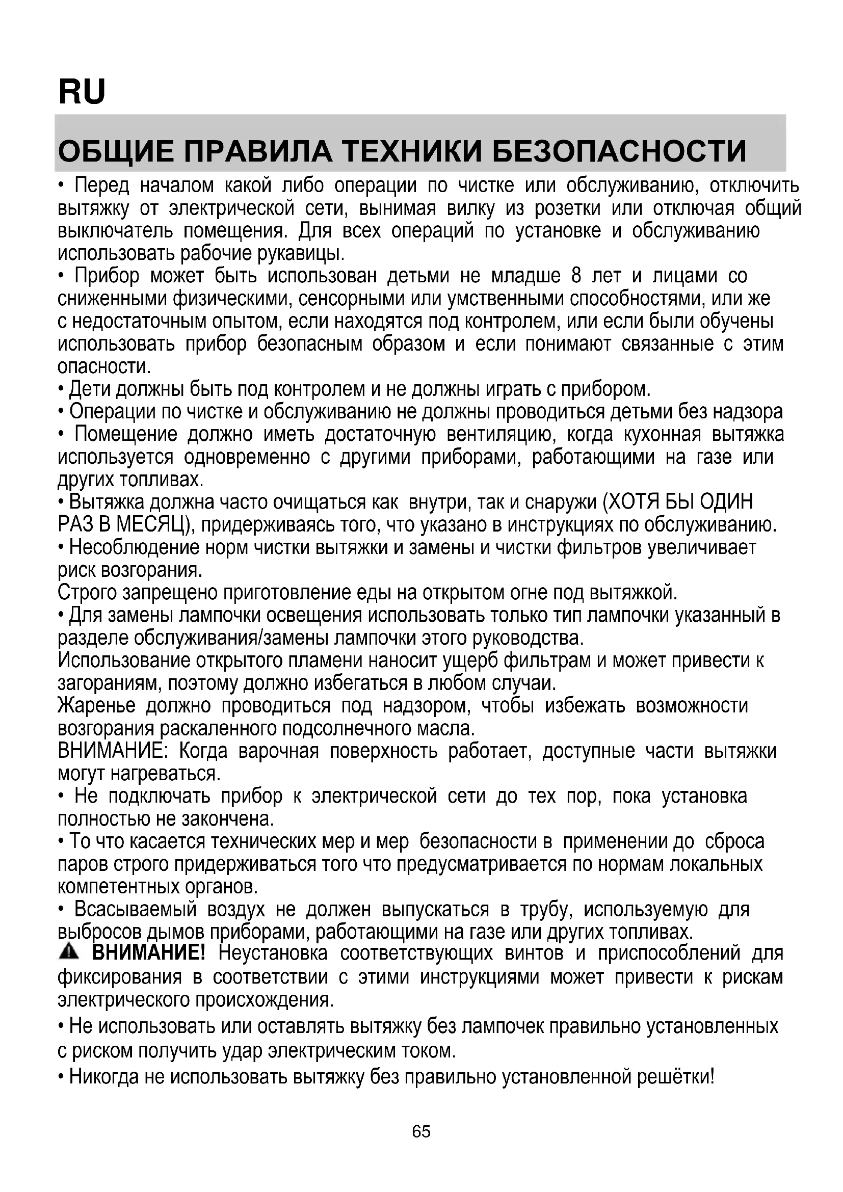 - Для замены лампочки освещения использовать только тип лампочки указанный в разделе обслуживания/замены лампочки этого руководства. Использование открытого пламени наносит ущерб фильтрам и может привести к загораниям, поэтому должно избегаться в любом случаи. Жаренье должно проводиться под надзором, чтобы избежать возможности возгорания раскаленного подсолнечного масла. ВНИМАНИЕ: Когда варочная поверхность работает, доступные части вытяжки могут нагреваться.