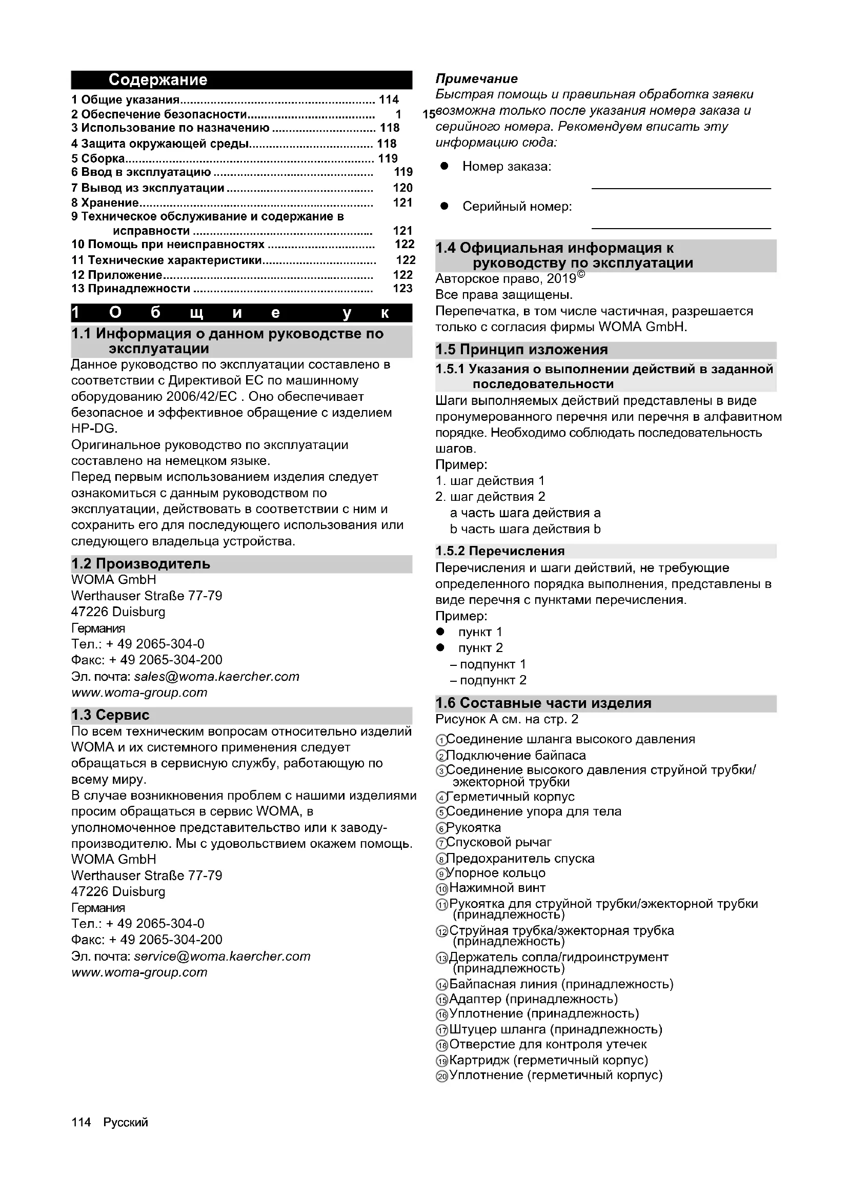 ить работу и безопасность водоструйной установки высокого давления. Использовать только оригинальные запасные части WOMA GmbH. В программе продукции WOMA имеются соответствующие комплекты запчастей, которые рассчитаны на срок службы конкретного изделия. Более подробную информацию можно получить у официального дистрибьютора WOMA. Использование деталей других производителей запрещено. Детали других производителей часто не отвечают спецификациям и требованиям. Детали