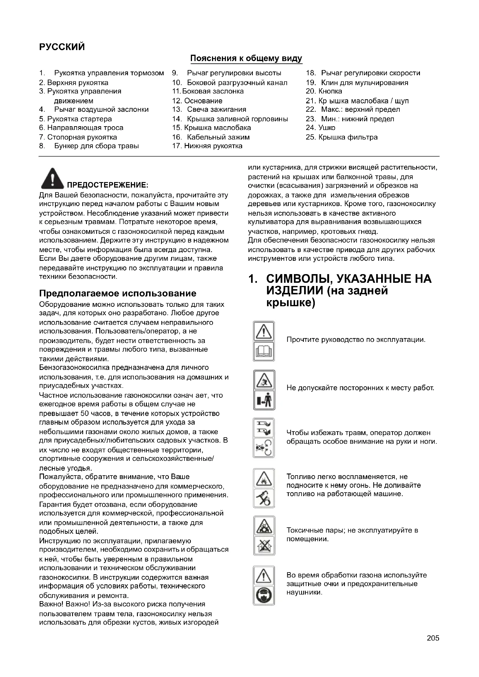 Пояснения к общему виду ПРЕДОСТЕРЕЖЕНИЕ: Для Вашей безопасности, пожалуйста, прочитайте эту инструкцию перед началом работы с Вашим новым устройством. Несоблюдение указаний может привести к серьезным травмам. Потратьте некоторое время, чтобы ознакомиться с газонокосилкой перед каждым использованием. Держите эту инструкцию в надежном месте, чтобы информация была всегда доступна. Если Вы даете оборудование другим лицам, также передавайте инс трукцию по эксп луатации и правила техники безопасности. Предполагаемое использование Оборудование можно использовать только для таких задач, для которых оно разработано. Любое другое использование считается случаем неправильного использования. Пользователь/оператор, а не производитель, будет нести ответственность за повреждения и травмы любого типа, вызванные такими действиями. Бензогазонокосилка предназначена для личного использования, т.е. для использования на домашних и приусадебных участках. Частное использование га зонокосилки означ