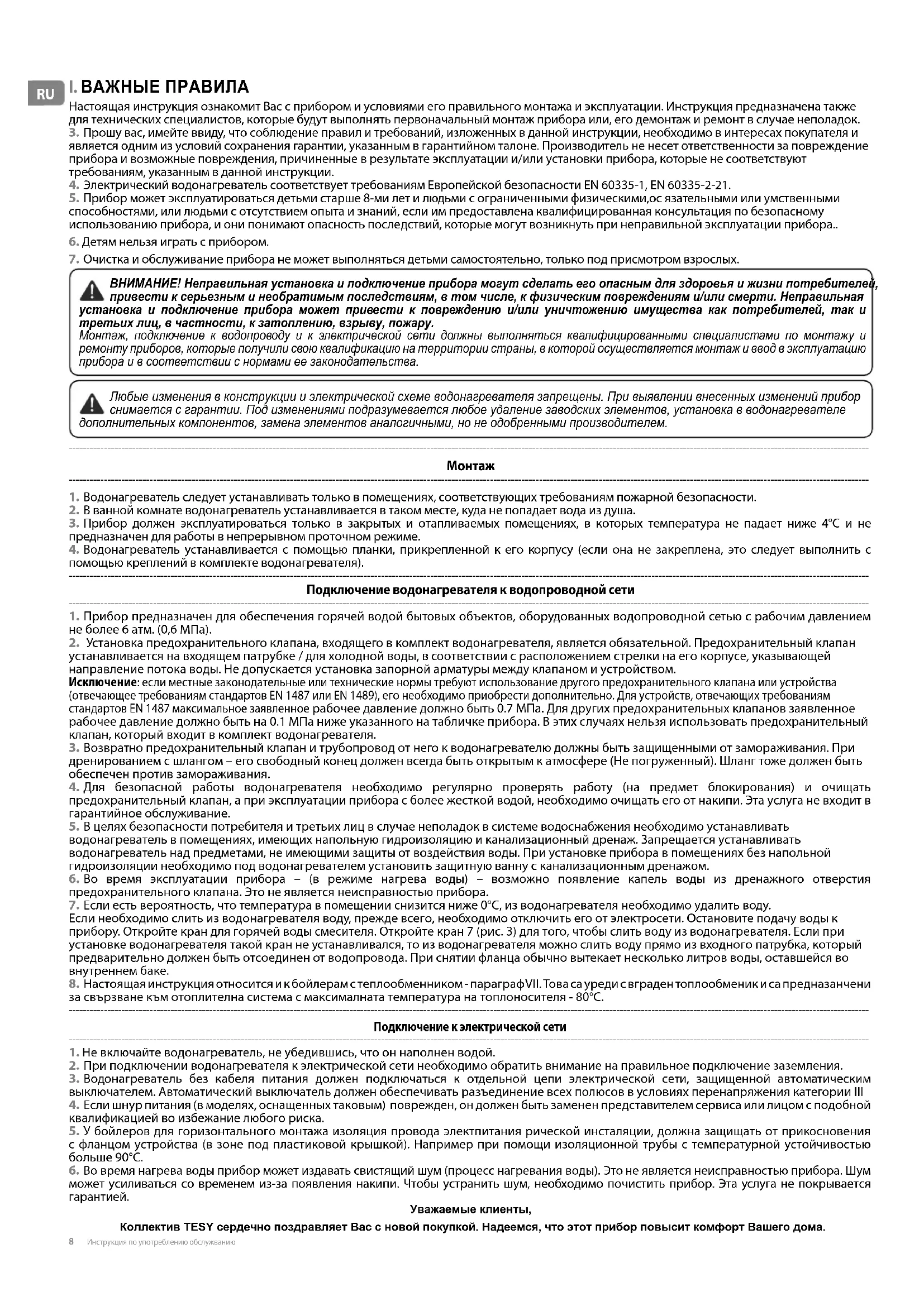 ВНИМАНИЕ! Неправильная установка и подключение прибора могут сделать его опасным для здоровья и жизни потребителей, привести к серьезным и необратимым последствиям, в том числе, к физическим повреждениям и/или смерти. Неправильная установка и подключение прибора может привести к повреждению и/или уничтожению имущества как потребителей, так и третьих лиц, в частности, к затоплению, взрыву, пожару. Монтаж, подключение к водопроводу и к электрической сети должны выполняться квалифицированными специалистами по монтажу и ремонту приборов, которые получили свою квалификацию на территории страны, в которой осуществляется монтаж и ввод в эксплуатацию прибора и в соответствии с нормами ее законодательства. Любые изменения в конструкции и электрической схеме водонагревателя запрещены. При выявлении внесенных изменений прибор снимается с гарантии. Под изменениями подразумевается любое удаление заводских элементов, установка в водонагревателе дополнительных компонентов, замена элементов аналогичными, но не одобренными производителем.